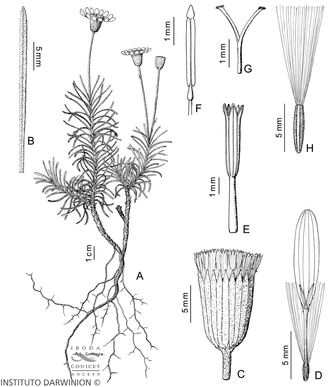 Sufrútices de 15-25 cm de alto, plateado-tomentosos; tallos ascendentes, ramosos, simples o poco divididos, densamente hojosos en la base y desnudos en la parte superior. Hojas lineares, de 1,5-3 cm × 1-2 mm, obtusas en el ápice, enteras y revolutas en el margen. Capítulos radiados o discoides, solitarios en el ápice de las ramas. Involucro acampanado, de 7-12 × 8-10 mm, muy brevemente caliculado; filarios ca. 20, lineares, agudos y penicilados en el ápice, tomentosos en el dorso. Flores dimorfas o isomorfas, con corolas amarillas, cuando dimorfas con 10-13 flores del margen, liguladas, con lígula elíptica de unos 10 × 2,5 mm y flores del centro numerosas, con corolas tubulosas de unos 8 mm de largo, 5-lobadas, lóbulos ca. 0,8 mm de largo. Aquenios cilindroides, ca. 5 mm de largo, costados, cortamente papilosos. Papus blanco ca. 10 mm de largo.