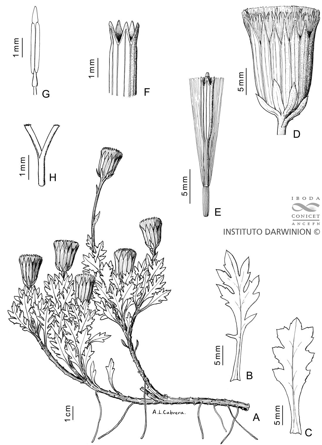 A. Tallo postrado con ramas ascendentes floríferas. B-C. Hojas. D. Capítulo. E. Flor. F. Ápice de la corola. G. Estambre. H. Porción superior del estilo.