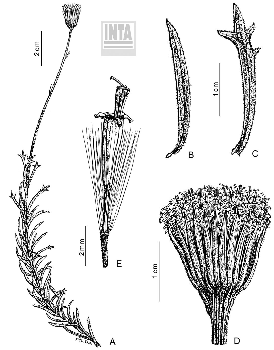A. Rama florífera. B-C. Hojas. D. Capítulo. E. Flor.
