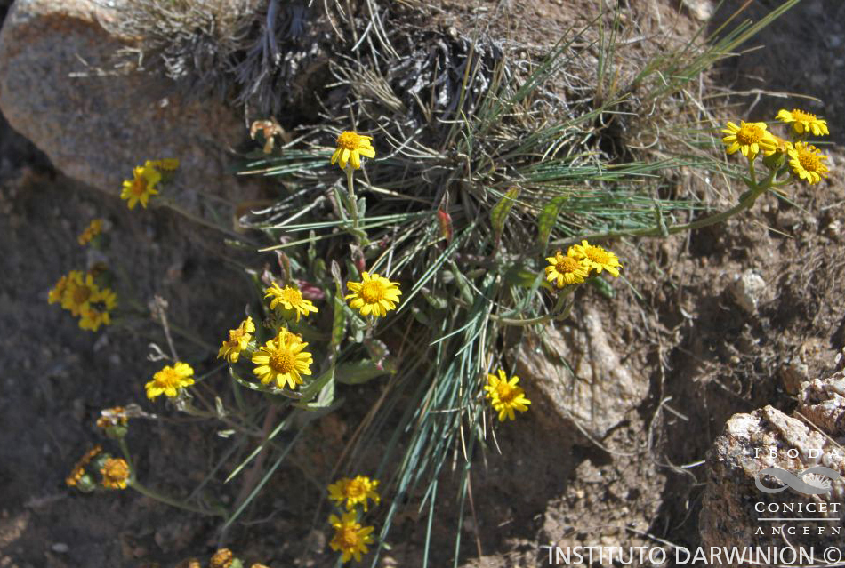 Sufrútices ramosos en la base, de 30-50 cm de alto, densamente glanduloso-flocosos; tallos erectos, hojosos hasta la inflorescencia. Hojas oblanceoladas, de 5-10 × 0,6-2 cm, atenuadas en la parte inferior, ensanchadas y auriculadas en la base, agudas en el ápice, uniformemente dentadas en el margen. Capítulos radiados, pocos, dispuestos en cimas corimbiformes laxas, terminales. Involucro acampanado, ca. 12 × 9-10 mm; brácteas del calículo lineares, casi tan largas como el involucro, glanduloso-pubescentes en el dorso; filarios ca. 20, lineares, atenuados en el ápice, densamente glanduloso-flocosos en el dorso. Flores dimorfas, numerosas, las del margen 12-15, con corolas amarillas, liguladas; las del centro numerosas, con corolas tubulosas, de 6-7 mm de largo, 5-lobadas. Aquenios cilindroides, ca. 3 mm de largo, con pelitos cortos entre las costillas. Papus blanco ca. 7 mm de largo.