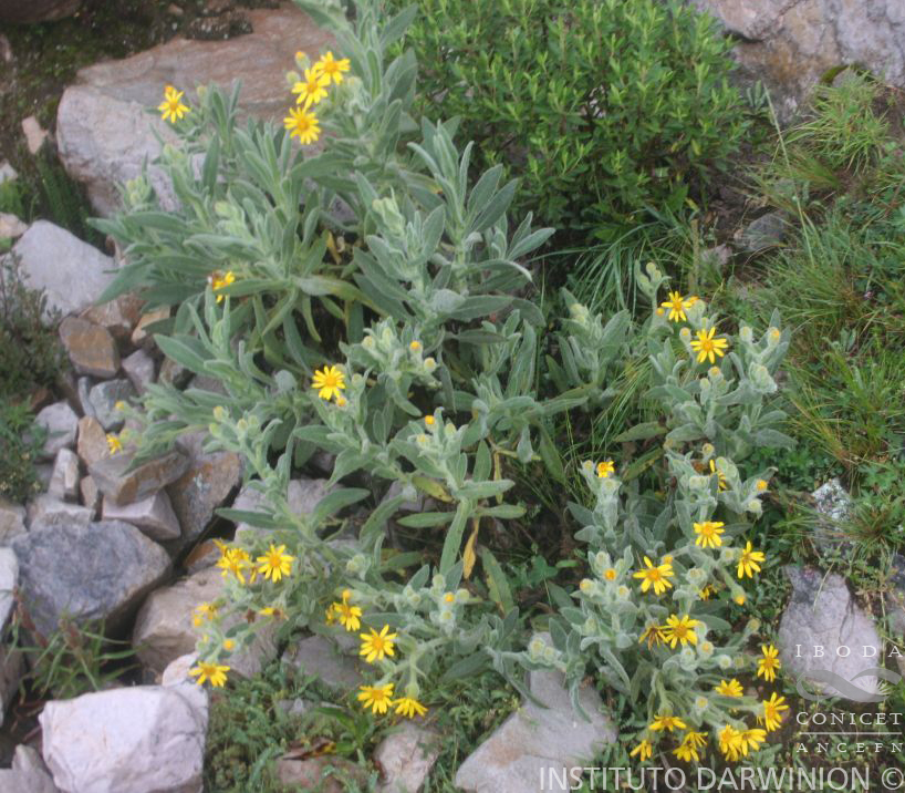 Sufrútices ramosos en la base, de 30-50 cm de alto, densamente glanduloso-flocosos; tallos erectos, hojosos hasta la inflorescencia. Hojas oblanceoladas, de 5-10 × 0,6-2 cm, atenuadas en la parte inferior, ensanchadas y auriculadas en la base, agudas en el ápice, uniformemente dentadas en el margen. Capítulos radiados, pocos, dispuestos en cimas corimbiformes laxas, terminales. Involucro acampanado, ca. 12 × 9-10 mm; brácteas del calículo lineares, casi tan largas como el involucro, glanduloso-pubescentes en el dorso; filarios ca. 20, lineares, atenuados en el ápice, densamente glanduloso-flocosos en el dorso. Flores dimorfas, numerosas, las del margen 12-15, con corolas amarillas, liguladas; las del centro numerosas, con corolas tubulosas, de 6-7 mm de largo, 5-lobadas. Aquenios cilindroides, ca. 3 mm de largo, con pelitos cortos entre las costillas. Papus blanco ca. 7 mm de largo.