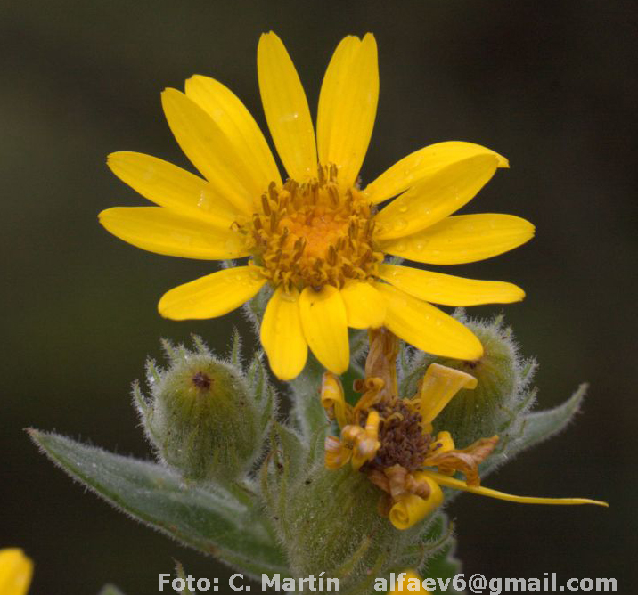 Sufrútices ramosos en la base, de 30-50 cm de alto, densamente glanduloso-flocosos; tallos erectos, hojosos hasta la inflorescencia. Hojas oblanceoladas, de 5-10 × 0,6-2 cm, atenuadas en la parte inferior, ensanchadas y auriculadas en la base, agudas en el ápice, uniformemente dentadas en el margen. Capítulos radiados, pocos, dispuestos en cimas corimbiformes laxas, terminales. Involucro acampanado, ca. 12 × 9-10 mm; brácteas del calículo lineares, casi tan largas como el involucro, glanduloso-pubescentes en el dorso; filarios ca. 20, lineares, atenuados en el ápice, densamente glanduloso-flocosos en el dorso. Flores dimorfas, numerosas, las del margen 12-15, con corolas amarillas, liguladas; las del centro numerosas, con corolas tubulosas, de 6-7 mm de largo, 5-lobadas. Aquenios cilindroides, ca. 3 mm de largo, con pelitos cortos entre las costillas. Papus blanco ca. 7 mm de largo.