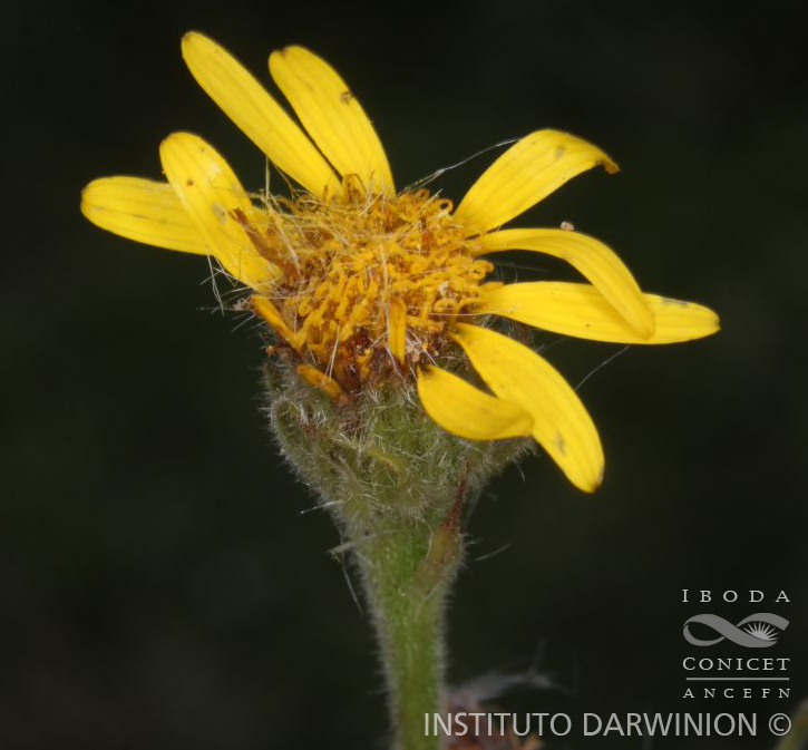 Sufrútices ramosos en la base, de 30-50 cm de alto, densamente glanduloso-flocosos; tallos erectos, hojosos hasta la inflorescencia. Hojas oblanceoladas, de 5-10 × 0,6-2 cm, atenuadas en la parte inferior, ensanchadas y auriculadas en la base, agudas en el ápice, uniformemente dentadas en el margen. Capítulos radiados, pocos, dispuestos en cimas corimbiformes laxas, terminales. Involucro acampanado, ca. 12 × 9-10 mm; brácteas del calículo lineares, casi tan largas como el involucro, glanduloso-pubescentes en el dorso; filarios ca. 20, lineares, atenuados en el ápice, densamente glanduloso-flocosos en el dorso. Flores dimorfas, numerosas, las del margen 12-15, con corolas amarillas, liguladas; las del centro numerosas, con corolas tubulosas, de 6-7 mm de largo, 5-lobadas. Aquenios cilindroides, ca. 3 mm de largo, con pelitos cortos entre las costillas. Papus blanco ca. 7 mm de largo.