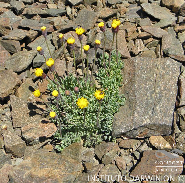 Sufrútices pigmeos, formando matas de céspedes densos de apenas 10 cm de alto, glabros; tallos ascendentes, ramosos, densamente hojosos en la parte inferior y casi escapiformes en la superior. Hojas crasas, linear-espatuladas, de 1-3 cm × 2-5 mm, atenuadas en la base, obtusas en el ápice, con 1-2 lóbulos a cada lado. Capítulos discoides, solitarios en los ápices de los tallos. Involucro acampanado, de 10-12 × 10-12 mm; brácteas del calículo lineares, cortas; filarios ca. 15-20, linear-lanceolados, glabros en el dorso. Flores isomorfas, numerosas, con corolas amarillas, tubulosas, de 7-8 mm de largo, cortamente 5-lobadas, lóbulos ca. 0,7 mm de largo. Aquenios cilindroides, ca. 6 mm de largo, costados, glabros. Papus blanco ca. 7,5 mm de largo.