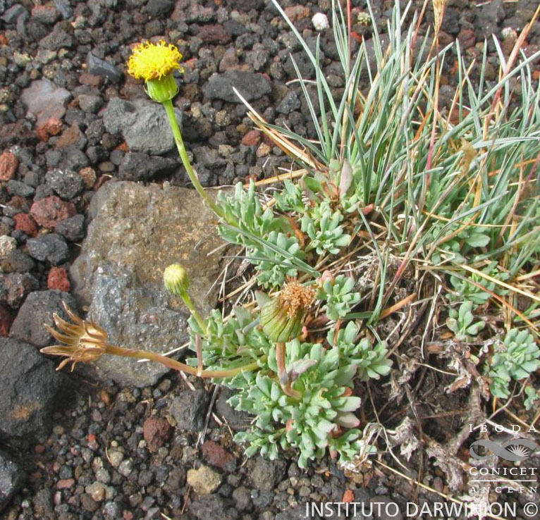 Sufrútices pigmeos, formando matas de céspedes densos de apenas 10 cm de alto, glabros; tallos ascendentes, ramosos, densamente hojosos en la parte inferior y casi escapiformes en la superior. Hojas crasas, linear-espatuladas, de 1-3 cm × 2-5 mm, atenuadas en la base, obtusas en el ápice, con 1-2 lóbulos a cada lado. Capítulos discoides, solitarios en los ápices de los tallos. Involucro acampanado, de 10-12 × 10-12 mm; brácteas del calículo lineares, cortas; filarios ca. 15-20, linear-lanceolados, glabros en el dorso. Flores isomorfas, numerosas, con corolas amarillas, tubulosas, de 7-8 mm de largo, cortamente 5-lobadas, lóbulos ca. 0,7 mm de largo. Aquenios cilindroides, ca. 6 mm de largo, costados, glabros. Papus blanco ca. 7,5 mm de largo.