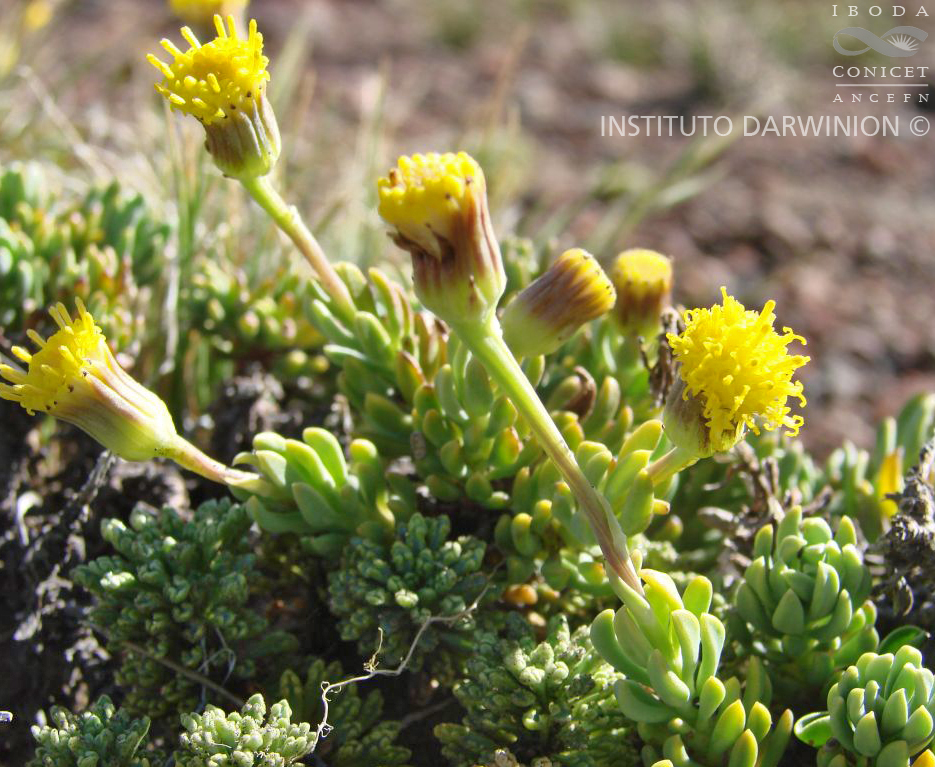 Sufrútices pigmeos, formando matas de céspedes densos de apenas 10 cm de alto, glabros; tallos ascendentes, ramosos, densamente hojosos en la parte inferior y casi escapiformes en la superior. Hojas crasas, linear-espatuladas, de 1-3 cm × 2-5 mm, atenuadas en la base, obtusas en el ápice, con 1-2 lóbulos a cada lado. Capítulos discoides, solitarios en los ápices de los tallos. Involucro acampanado, de 10-12 × 10-12 mm; brácteas del calículo lineares, cortas; filarios ca. 15-20, linear-lanceolados, glabros en el dorso. Flores isomorfas, numerosas, con corolas amarillas, tubulosas, de 7-8 mm de largo, cortamente 5-lobadas, lóbulos ca. 0,7 mm de largo. Aquenios cilindroides, ca. 6 mm de largo, costados, glabros. Papus blanco ca. 7,5 mm de largo.