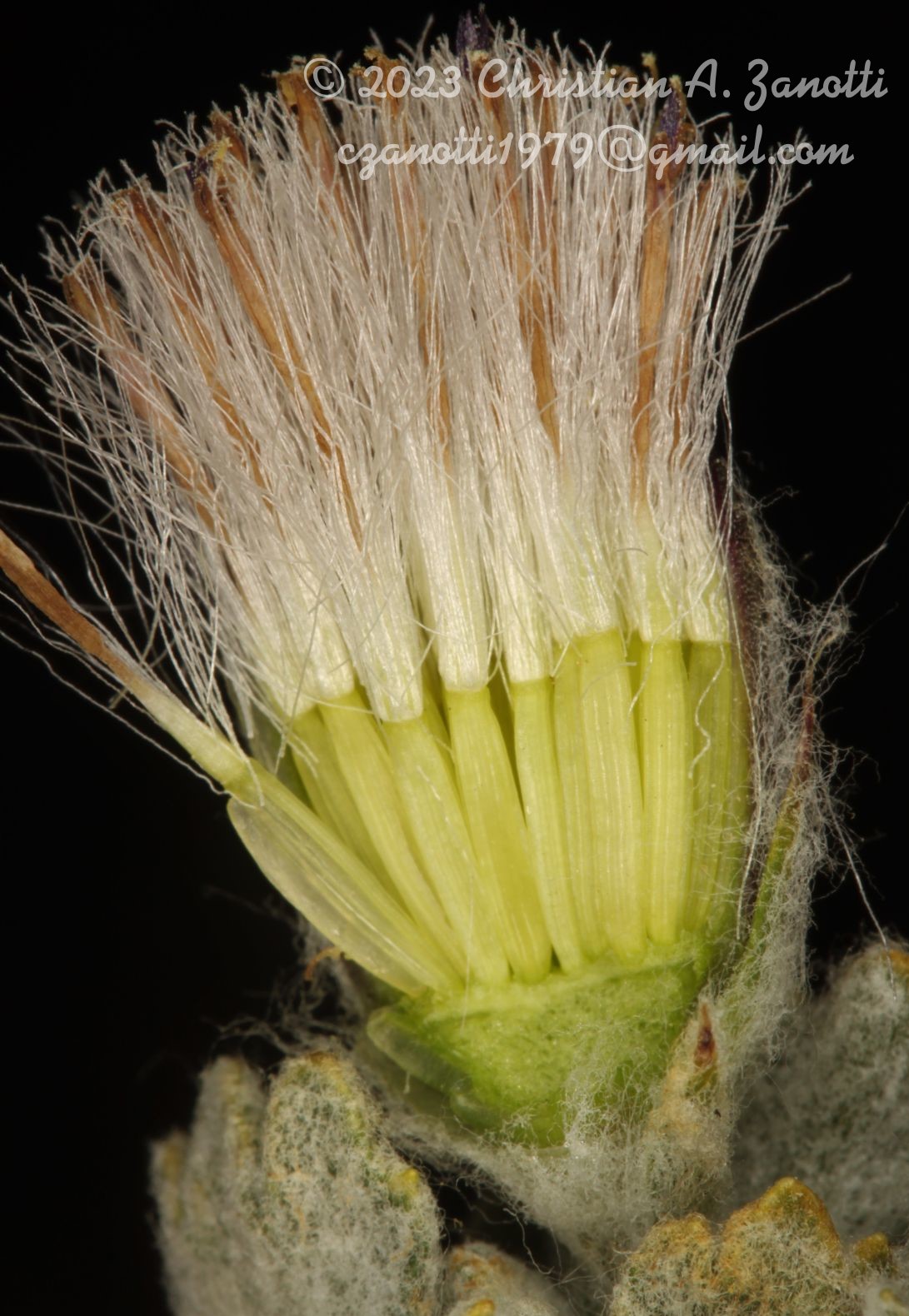 Sufrútices enanos, cespitosos, de 4-10 cm de alto, densamente albo-tomentosos; tallos aéreos decumbentes o ascendentes, hojosos hasta el ápice. Hojas muy apretadas, espatuladas, de 1,5-2 cm × 5-8 mm, atenuadas en la base, obtuso-dentadas en el ápice, raramente enteras, densamente albo-tomentosas en ambas caras. Capítulos discoides, solitarios en el ápice de las ramitas, rodeados por las hojas superiores; sésiles o cortamente pedunculados; pedúnculos de 2-6 mm de largo. Involucro acampanado, de 10-12 × 10-14 mm, brácteas del calículo pocas, lineares y largas; filarios 22-25, lineares, penicilados en el ápice, densamente tomentosos en el dorso. Flores isomorfas, muy numerosas, con corolas amarillas, tubulosas, de 8-9 mm de largo, cortamente 5-lobadas, lóbulos ca. 0,6 mm de largo. Aquenios cilindroides, costados, glabros. Papus blanco, de 7-8 mm de largo.