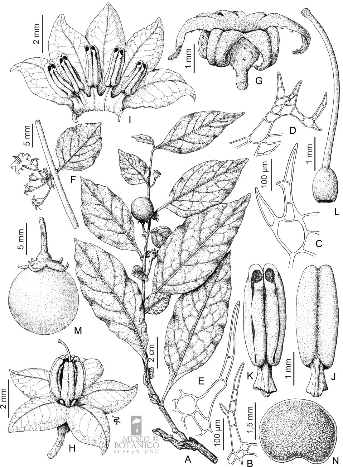 A. Rama fructífera. B. Tricoma bifurcado del epifilo. C. Tricoma ramificado del epifilo. D. Tricoma dendrítico del hipofilo. E. Tricoma simple del epifilo. F. Inflorescencia. G. Cáliz. H. Flor. I. Corola desplegada. J. Estambre, vista dorsal. K. Estambre, vista ventral. L. Gineceo. M. Fruto. N. Semilla.