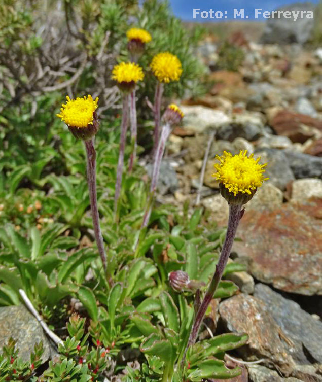 Hierbas perennes, ramosas, de 10-18 cm de alto, laxamente tomentosas o glabras; tallos erectos, simples, escapiformes. Hojas basales subarrosetadas, algo carnosas, con láminas oblanceolado-espatuladas, de 3,5-7 cm × 7-14 mm, atenuadas en la parte inferior en un pseudopecíolo envainador, obtusas en el ápice, con 7-10 dientes a cada lado, glabras en ambas caras; hojas caulinares pocas, las inferiores semejantes a las basales, las superiores bracteiformes. Capítulos discoides, solitarios en el ápice de los tallos. Involucro anchamente acampanado, de 8-10 × 12-15 mm; brácteas del calículo lineares, alcanzando la mitad del involucro, tomentosas en el dorso; filarios 20-25, oblongo-lanceolados, agudos y penicilados en el ápice, lanuginosos o glabros en el dorso. Flores isomorfas, muy numerosas, con corolas amarillo-anaranjadas, tubulosas, ca. 7 mm de largo, 5-lobadas, lóbulos lanceolados, ca. 1 mm de largo. Aquenios cilindroides, ca. 4 mm de largo, costados, cortamente pilosos. Papus blanco.