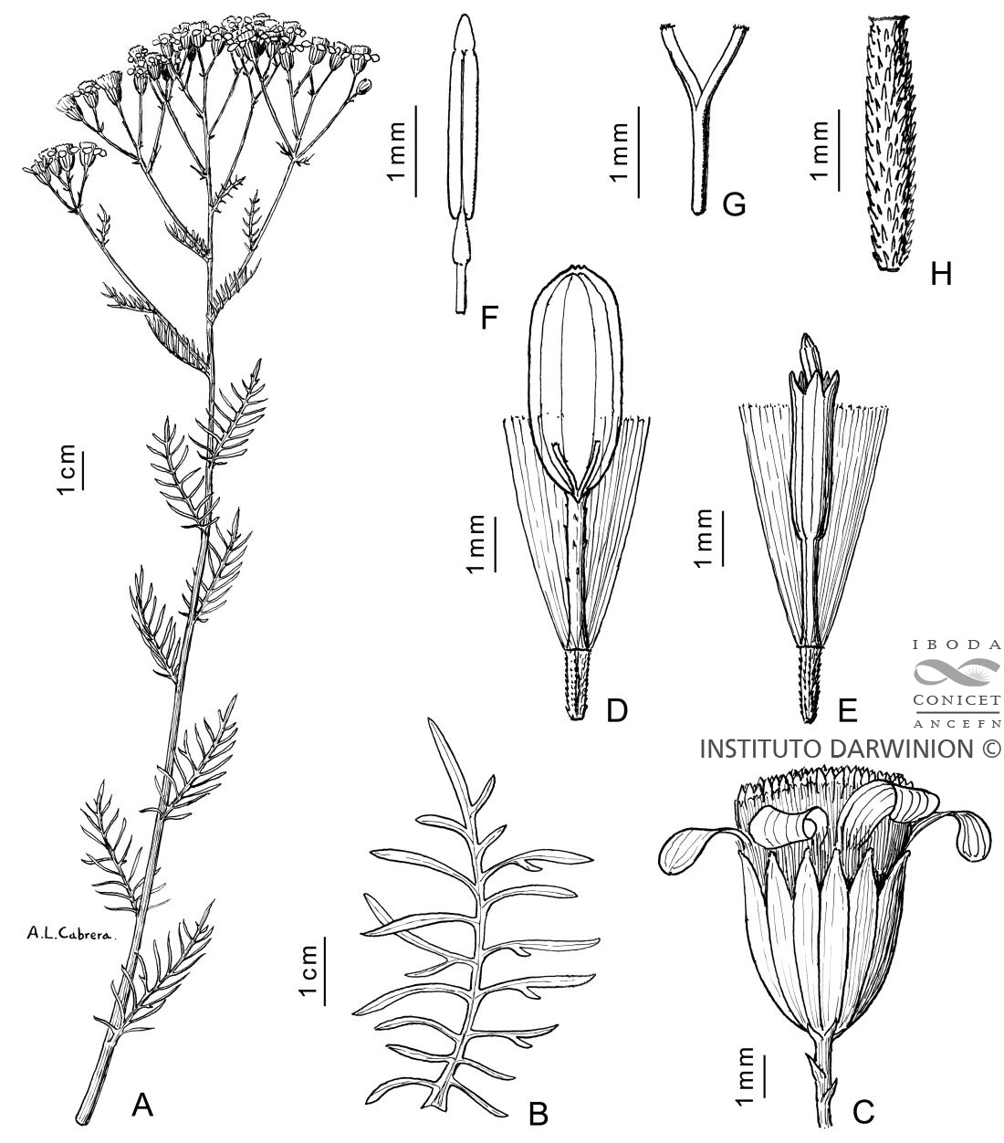 A. Rama florífera. B. Hoja. C. Capítulo. D. Flor del margen. E. Flor del centro. F. Estambre. G. Porción superior del estilo. H. Aquenio.