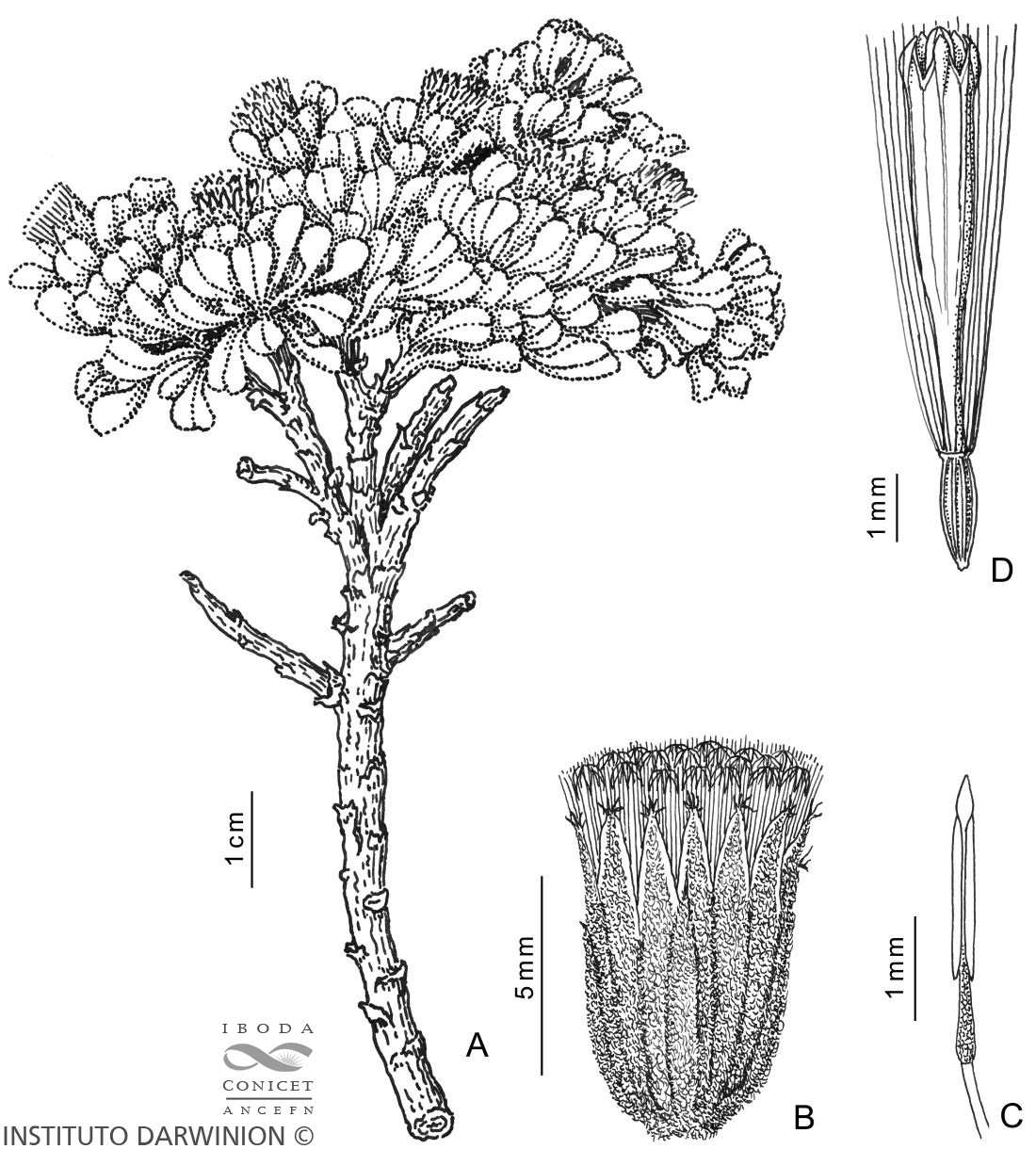 Sufrútices pigmeos, subacaules, formando pequeños cojines ca. 2 cm de alto, albo-lanosos; tallos cortos, tendidos, densamente hojosos hasta el ápice. Hojas dispuestas muy densamente, con láminas obovado-espatuladas, de 1-2 cm × 3-6 mm, atenuadas en pseudopecíolo, redondeadas en el ápice y enteras en el margen, albo-lanosas en ambas caras. Capítulos discoides, solitarios en el ápice de las ramitas, sésiles o cortamente pedunculados. Involucro acampanado, de 7-8 × 5-6 mm; brácteas del calículo pocas, lineares, lanosas; filarios 13-20, lineares, agudos y penicilados en el ápice, densamente lanosos en el dorso. Flores isomorfas, numerosas, con corolas amarillas, tubulosas, ca. 7 mm de largo, 5-lobadas, lóbulos ca. 0,5 mm de largo. Aquenios cilindroides, costados, glabros. Papus blanco.