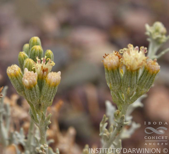 Arbustos hemisféricos, ramosos, de 0,50-1 m de alto, densamente tomentosos; tallos hojosos hasta el ápice. Hojas alternas, sésiles, con láminas lineares, de 1-4 cm × 1-2 mm, agudas en el ápice, enteras o con 1-3 pares de dientes o lóbulos cortos, densamente tomentosas en ambas caras (casi glabras en ejemplares viejos). Capítulos discoides, dispuestos en cimas corimbiformes densas en el ápice de los tallos. Involucro cilíndrico, de 5-7,5 × 4-5 mm; brácteas del calículo pocas, muy cortas; filarios 8-14, lanceolados, generalmente penicilados en el ápice, lanosos o casi glabros en el dorso. Flores isomorfas 15-25, con corolas amarillentas o rosadas, tubulosas, de 6-8 mm de largo, cortamente 5-lobadas, lóbulos triangulares, de 4-5 mm de largo. Aquenios cilindroides, ca. 4 mm de largo, densa y cortamente pubescentes. Papus blanco, de 7-8 mm de largo.