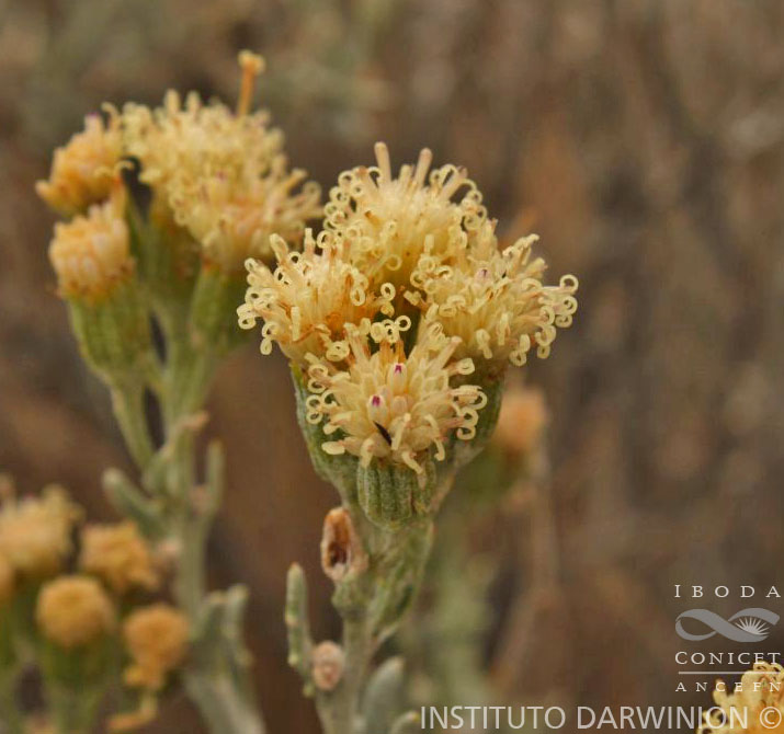 Arbustos hemisféricos, ramosos, de 0,50-1 m de alto, densamente tomentosos; tallos hojosos hasta el ápice. Hojas alternas, sésiles, con láminas lineares, de 1-4 cm × 1-2 mm, agudas en el ápice, enteras o con 1-3 pares de dientes o lóbulos cortos, densamente tomentosas en ambas caras (casi glabras en ejemplares viejos). Capítulos discoides, dispuestos en cimas corimbiformes densas en el ápice de los tallos. Involucro cilíndrico, de 5-7,5 × 4-5 mm; brácteas del calículo pocas, muy cortas; filarios 8-14, lanceolados, generalmente penicilados en el ápice, lanosos o casi glabros en el dorso. Flores isomorfas 15-25, con corolas amarillentas o rosadas, tubulosas, de 6-8 mm de largo, cortamente 5-lobadas, lóbulos triangulares, de 4-5 mm de largo. Aquenios cilindroides, ca. 4 mm de largo, densa y cortamente pubescentes. Papus blanco, de 7-8 mm de largo.