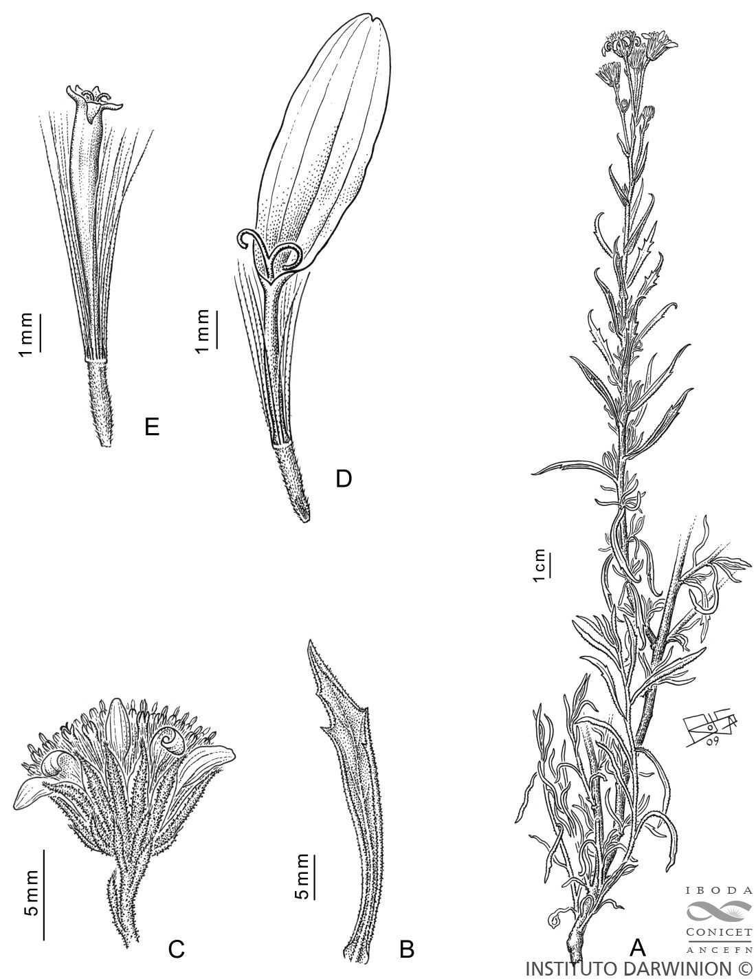 A. Rama florífera. B. Hoja. C. Capítulo. D. Flor del margen. E. Flor del centro.
