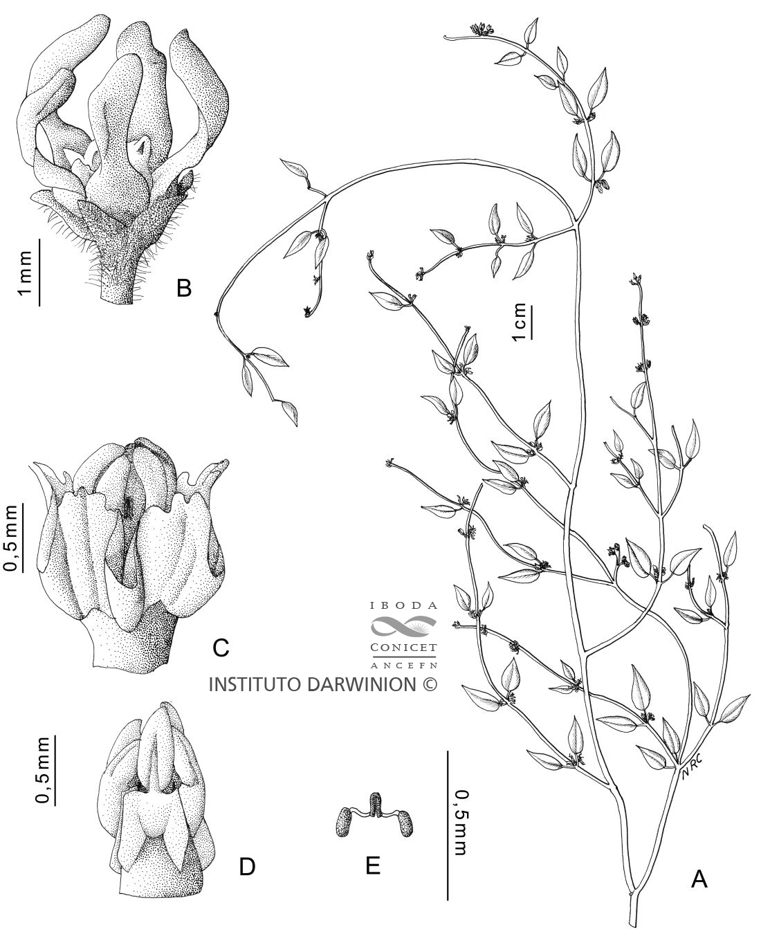 Voluble, ramas uniformemente hirsutas, pilosas o pubescentes. Hojas con pecíolo de 2-10 mm de largo; lámina elíptica, de 1,5-4 × 1-1,5 cm, esparsamente setosa a pilosa, submembranácea, frecuentemente discolora; base cuneada a obtusa; ápice agudo a acuminado. Inflorescencias tirsoideas frondosas; cimas umbeliformes con 3-10 flores; pedúnculo de 1-5 mm de largo. Flores con pedicelo de 1,5-2 mm de largo, cáliz abaxialmente piloso o hirsuto, adaxialmente glabro; lóbulos ovados, de 0,8-1 mm de largo; corola campanulada, cara abaxial esparsamente hirsuta a glabra, cara adaxial con papilas largas cerca del margen y en la región apical; tubo de 0,4-0,6 mm de largo; lóbulos lanceolados a suboblongos, de 1,65-1,95 mm de largo; corona con segmentos 3-lobulados, lóbulo intermedio mayor que los laterales, globoso a obovoide, más corto que las anteras, simple o provistos de una lígula membranácea en la cara abaxial; ginostegio sésil; anteras con apéndice membranáceo semicircular a subovado; cabeza estilar obtusa a aguda; retináculo largamente oblongo a subobovoide, de 0,05-0,07 mm de largo; caudículas horizontales, rectas, de 0,04-0,05 mm de largo; polinios elipsoides, obovoides o fusiformes, ca. 0,05 mm de largo. Folículos uno o dos por flores, de 2,5-3 cm de largo, con la base esférica de 0,6 mm de diámetro, que contiene las semillas y un largo pico o ápice enangostado, estéril. Semillas estrechamente ovoideas, de 6 × 2 mm, con margen involuto, superficie tuberculada; no marginada; penacho de pelos blancos de 15-20 mm de largo.