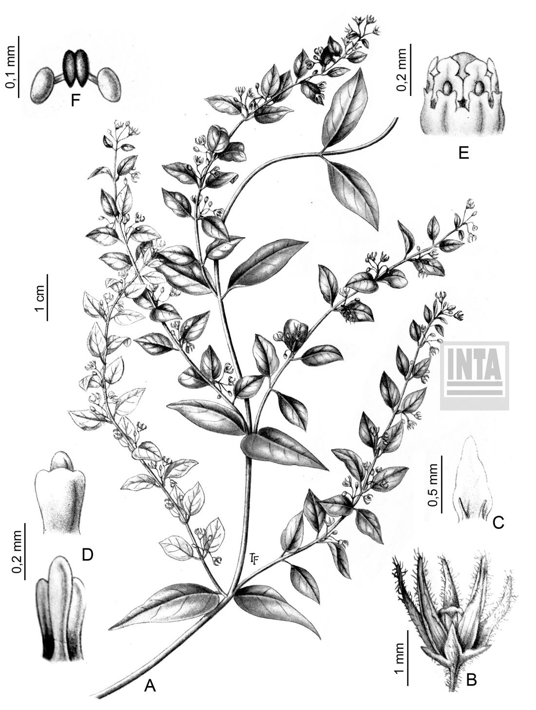 A. Rama florífera. B. Flor. C. Coléteres en el cáliz. D. Lóbulo de la corona, vistas dorsal y ventral. E. Ginostegio. F. Polinario. Tomado de Gen. Sp. Pl. Argent. 2: lámina 74B. 1944 (sub Ditassa anomala).