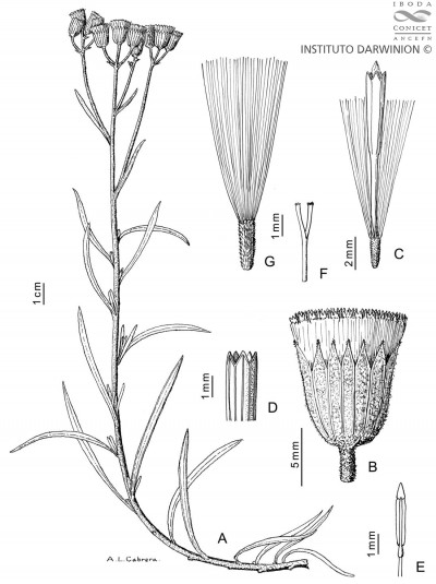 Sufrútices ramosos, de 30-50 cm de alto, densamente albotomentosos. Hojas lanceolado-lineares, de 2-8 cm × 3-6 mm, enteras y revolutas en el margen. Capítulos discoides, dispuestos en número de 3-15 en el extremo de las ramas, formando cimas corimbiformes compuestas; pedúnculos bractéolados de 5-30 mm de largo. Involucro acampanado, de 9-11 × 8-12 mm; brácteas del calículo pocas, cortas; filarios 10-14, linear-lanceolados, penicilados en el ápice y tomentosos en el dorso. Flores isomorfas, numerosas, con corolas de color amarillo pálido, tubulosas, ca. 11 mm de largo, 5-lobadas, lóbulos triangulares, ca. 0,5 mm de largo. Aquenios cilindroides, ca. 2,5 mm de largo, costados, densa y cortamente pubescentes. Papus blanco de 8-9 mm de largo.