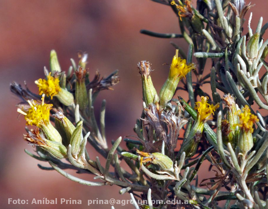 Sufrútices de 15-25 cm de alto, densamente gríseo-tomentosos; tallos erectos, ramosos, costados, densamente hojosos. Hojas alternas, lineares, de 10-35 × 1-1,5 mm, enteras y revolutas en el margen, algo crasas y densamente tomentosas en ambas caras. Capítulos subdiscoides, en número de (1)-2-(3), en los ápices de las ramas; pedúnculos ca. 4 mm de largo, bractéolados. Involucro cilíndrico, de 8-9 × 3 mm; brevemente caliculado; filarios ca. 8, oblongos, agudos, tomentosos en el dorso. Flores dimorfas, las del margen ca. 5, con corolas amarillas, filiformes, ca. 4 mm de largo; las del centro 8-10, con corlas tubulosas, ca. 7 mm de largo, 5-lobadas, lóbulos triangulares, ca. 0,5 mm de largo. Aquenios cilindroides, de 3-3,5 mm de largo, pilosos. Papus blanco.