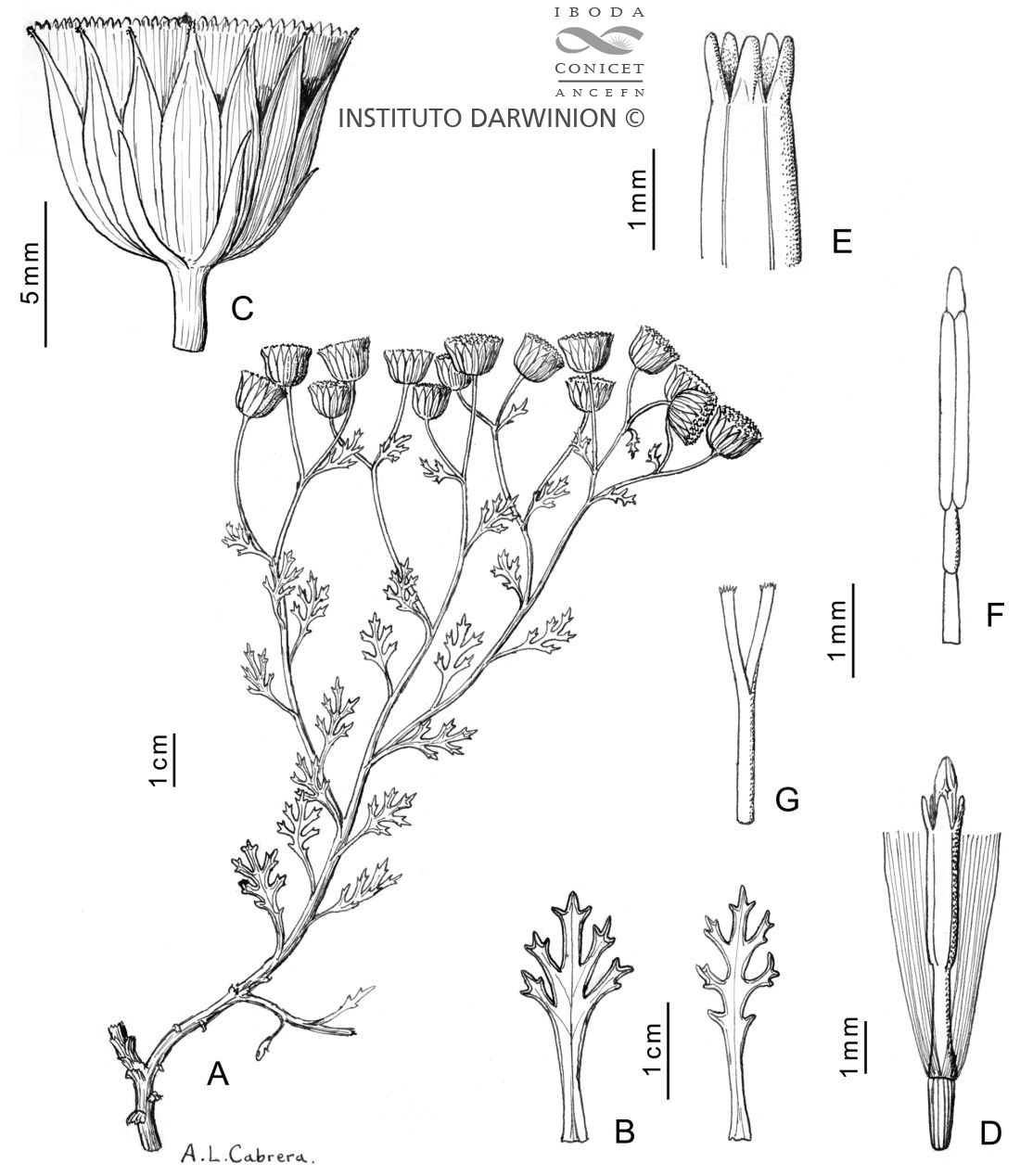 Sufrútices densamente ramosos, de 20-30 cm de alto, glabérrimos; tallos ascendentes, estriados, hojosos hasta la inflorescencia. Hojas alternas de contorno espatulado, más o menos profundamente pinnatilobadas y largamente atenuadas en la base en pseudopecíolo, de 1,5-2,8 cm × 4-11 mm, con 2-4 lóbulos a cada lado, lóbulos de 1-2 mm de ancho, por lo común dentados, revolutos en el margen, glabros en ambas caras. Capítulos discoides, dispuestos en cimas corimbiformes laxas, paucicéfalas; pedúnculos de 5-30 mm de largo, desnudos o con alguna bractéola. Involucro anchamente acampanado, de 7-8 × 9-12 mm; brácteas del calículo pocas, lineares, alcanzando la mitad del involucro; filarios ca. 12, lanceolados, atenuados y penicilados en el ápice, glabros en el dorso. Flores isomorfas, numerosas, con corolas amarillas, tubulosas, ca. 6 mm de largo, 5-lobadas, lóbulos estrechamente triangulares, de 0,6-0,7 mm de largo. Aquenios glabros. Papus blanco ca. 5,5 mm de largo.