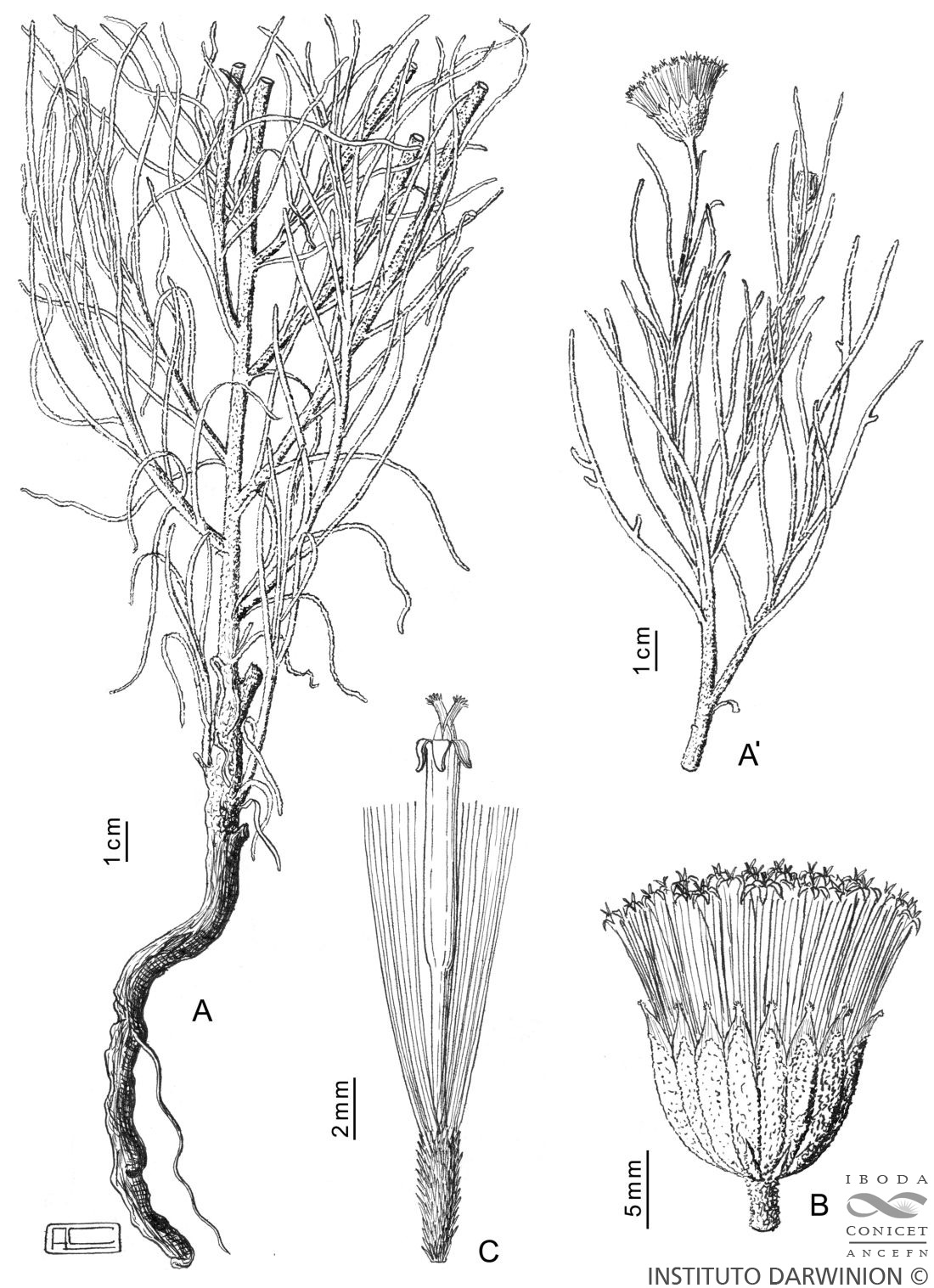 A-A’. Planta. B. Capítulo. C. Flor.
