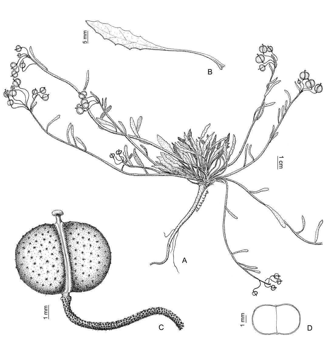 A. Planta. B. Hoja basal. C. Silícula y pedicelo. D. Silícula, corte transversal (diagrama).