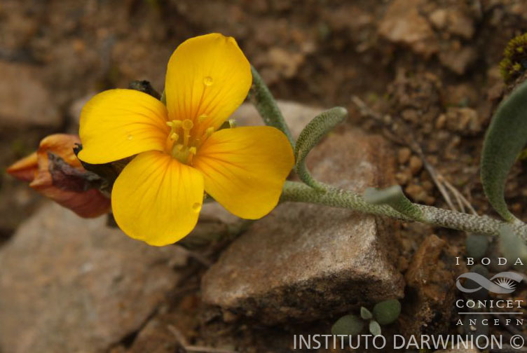 Hierbas perennes, completamente pubescentes, con tricomas estrellados, argénteos; caúdice grueso, leñoso, simple o ramificado, a menudo con remanentes de hojas de años anteriores, ramas terminadas en grupos de hojas. Tallos pocos a numerosos, procumbentes o decumbentes, de 3-13(-15) cm de largo. Hojas basales subsésiles, rara vez con pecíolos hasta de 1 cm de largo; láminas espatuladas a estrechamente oblanceoladas, rara vez ampliamente espatuladas u obovadas, de 1-3(-5) cm × 2-3,5(- 5) mm, base atenuada, ápice obtuso a subagudo, margen entero. Hojas caulinares (5-)7-18(-28), dispuestas unilateralmente, espatuladas a estrechamente oblanceoladas, base atenuada, ápice obtuso, margen entero. Racimos (4-)5-9(-13)-floros, subcorimbosos, rara vez alargados considerablemente durante la fructificación; pedicelos fructíferos sigmoides, rara vez rectos, divaricados o rara vez ascendentes, densamente pubescentes, delgados, de 5-13 mm de largo. Sépalos estrechamente oblongos, no sacciformes en la base, de 5-7,5 × 1,5-2 mm, caducos, con pubescencia argéntea; pétalos amarillo pálidos a amarillo brillantes, rosados o purpúreos cuando secos, obovados, de 8-10(-13) × 3,5-5,5(-7) mm, ápice redondeado; anteras oblongoides, de 1-1,5 mm de largo; filamentos de 4,5-6 mm de largo; óvulos (6-)8-12. Frutos elipsoides a ovoides, de (6,5-)7- 9(-10) × (4-)5-7 mm, angustiseptados, escasamente pubescentes, sésiles a cortamente estipitados, obtusos a subcordados, ápice subagudo; estilo delgado, de (2,5-)3-5(-6,5) mm de largo, glabro o escasamente pubescente en la base; estigma ligeramente más ancho que el estilo. Semillas comprimidas, ovoides a ovoideorbiculares, no aladas, de (1,5-)2-2,5 × (1-)1,5-2 mm; cotiledones acumbentes.