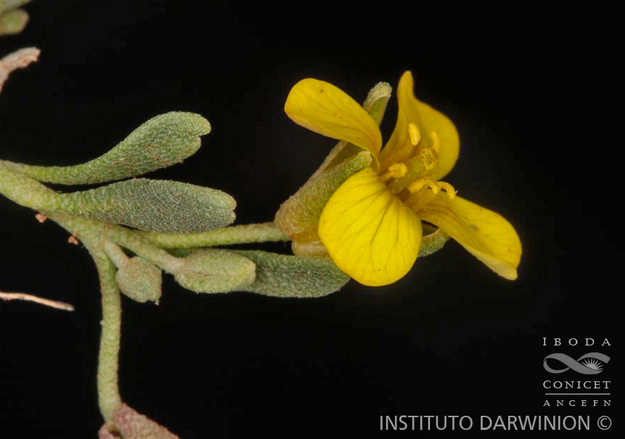 Hierbas perennes, completamente pubescentes, con tricomas estrellados, argénteos; caúdice grueso, leñoso, simple o ramificado, a menudo con remanentes de hojas de años anteriores, ramas terminadas en grupos de hojas. Tallos pocos a numerosos, procumbentes o decumbentes, de 3-13(-15) cm de largo. Hojas basales subsésiles, rara vez con pecíolos hasta de 1 cm de largo; láminas espatuladas a estrechamente oblanceoladas, rara vez ampliamente espatuladas u obovadas, de 1-3(-5) cm × 2-3,5(- 5) mm, base atenuada, ápice obtuso a subagudo, margen entero. Hojas caulinares (5-)7-18(-28), dispuestas unilateralmente, espatuladas a estrechamente oblanceoladas, base atenuada, ápice obtuso, margen entero. Racimos (4-)5-9(-13)-floros, subcorimbosos, rara vez alargados considerablemente durante la fructificación; pedicelos fructíferos sigmoides, rara vez rectos, divaricados o rara vez ascendentes, densamente pubescentes, delgados, de 5-13 mm de largo. Sépalos estrechamente oblongos, no sacciformes en la base, de 5-7,5 × 1,5-2 mm, caducos, con pubescencia argéntea; pétalos amarillo pálidos a amarillo brillantes, rosados o purpúreos cuando secos, obovados, de 8-10(-13) × 3,5-5,5(-7) mm, ápice redondeado; anteras oblongoides, de 1-1,5 mm de largo; filamentos de 4,5-6 mm de largo; óvulos (6-)8-12. Frutos elipsoides a ovoides, de (6,5-)7- 9(-10) × (4-)5-7 mm, angustiseptados, escasamente pubescentes, sésiles a cortamente estipitados, obtusos a subcordados, ápice subagudo; estilo delgado, de (2,5-)3-5(-6,5) mm de largo, glabro o escasamente pubescente en la base; estigma ligeramente más ancho que el estilo. Semillas comprimidas, ovoides a ovoideorbiculares, no aladas, de (1,5-)2-2,5 × (1-)1,5-2 mm; cotiledones acumbentes.