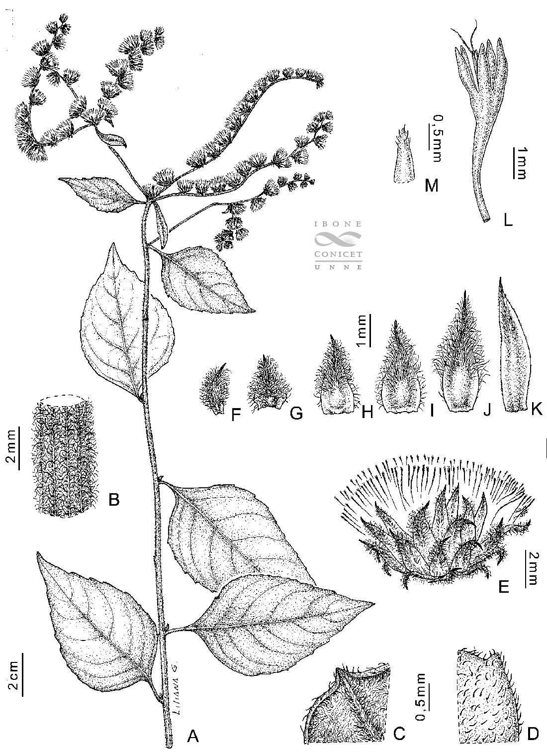 A. Rama florífera. B. Detalle de tallo. C-D. Detalles de hoja, cara abaxial (C) y adaxial (D). E. Capítulo. F-G. Filarios externos. H-I. Filarios intermedios. J-K. Filarios internos. L. Corola con detalle de las anteras y el ápice del estilo. M. Ápice del lóbulo de la corola, vista dorsal.