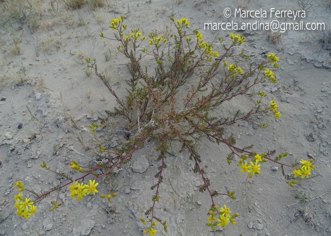 Arbustitos ramosos, de 30-50 cm de alto, glabros; tallos densamente hojosos. Hojas pinnatisectas, con raquis linear de 2-5 cm × 0,5-1 mm y 4-6 pares de segmentos lineares, de 3-10 × ca. 0,5 mm, enteros o más frecuentemente bifurcados en la base, casi perpendiculares al raquis y algo curvados hacia la base. Capítulos radiados, dispuestos en cimas corimbiformes laxas, paucicéfalas. Involucro acampanado, de 8-9 × 4-5 mm; brácteas del calículo pocas, cortas; filarios 8-10, linear-oblongos, agudos en el ápice, glabros en el dorso. Flores dimorfas, las del margen 5-8, con corolas amarillas, liguladas, lígula elíptica, de 5-6 × 1,5-2 mm; las del centro 16-18, con corolas tubulosas, ca. 8 mm de largo, cortamente 5-lobadas, lóbulos triangulares, ca. 0,5 mm de largo. Aquenios cilindroides, ca. 5 mm de largo, corta y densamente pilosos. Papus blanco ca. 8 mm de largo.