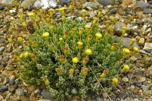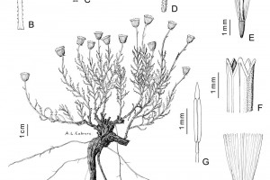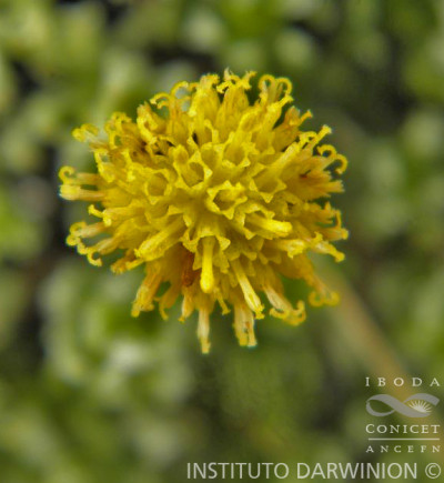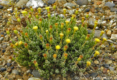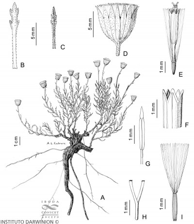 Sufrútices enanos, de 7-20 cm de alto, más o menos densamente papiloso-glandulosos; tallos ramosos, apretadamente hojosos hasta cerca del ápice. Hojas lineares o linear-espatuladas, de 8-25 × 0,5-2,5 mm, atenuadas en la base, agudas en el ápice, enteras o con 2-3 pares de dientes o lóbulos y revolutas en el margen, pubescente-glandulosas en ambas caras. Capítulos discoides, solitarios en el extremo de las ramas. Involucro acampanado, de 6-8 × 8-9 mm; brácteas del calículo pocas, cortas y lineares; filarios 13-19, linear-lanceolados, agudos en el ápice, glandulosos en el dorso. Flores isomorfas, numerosas, con corolas amarillas, tubulosas, de 5-6 mm de largo, cortamente 5-lobadas, lóbulos triangulares, ca. 0,6 mm de largo. Aquenios cilindroides, ca. 3 mm de largo, costados, glabros. Papus blanco de 5-6 mm de largo.