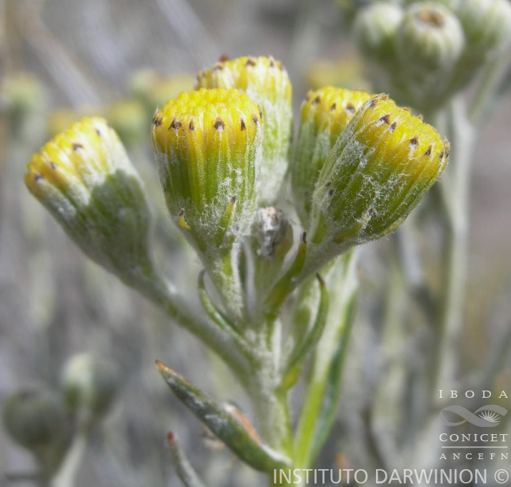 Sufrútices o arbustitos muy ramosos, de 50-60 cm de alto, laxamente tomentosos o glabrescentes; tallos ascendentes, hojosos hasta la inflorescencia. Hojas lineares, de 1-3,5 cm × 1-1,5 mm, subobtusas en el ápice, enteras o con 1-2 pares de lóbulos, crasas, laxamente tomentosas a glabras. Capítulos discoides, dispuestos en cimas corimbiformes densas en los ápices de las ramas; pedúnculos bractéolados, de 7-20 mm de largo. Involucro acampanado, ca. 5 × 5-6 mm; brácteas del calículo pocas, lineares, breves; filarios 9-13, lanceolados, agudos en el ápice y lanuginosos o glabros en el dorso. Flores isomorfas, ca. 20, con corolas amarillas, tubulosas, ca. 6 mm de largo, cortamente 5-lobadas, lóbulos triangulares, ca. 0,6 mm de largo. Aquenios cilindroides, ca. 4 mm de largo, costados, glabros. Papus blanco de 6-7 mm de largo.