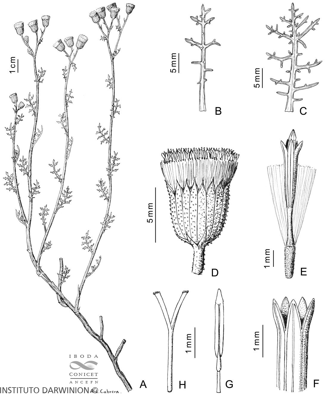 A. Rama florífera. B-C. Hojas. D. Capítulo. E. Flor. F. Ápice de la corola. G. Estambre. H. Porción superior del estilo.