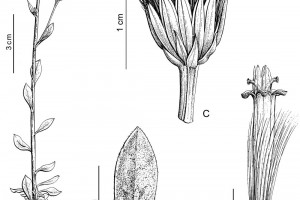 Sufrútices ramosos en la base, de 40-70 cm de alto, laxamente gríseo-tomentosos; tallos erectos o ascendentes, laxamente hojosos en el ápice. Hojas alternas, sésiles, oblanceolado-espatuladas, de 20-35 × 4-8 mm, atenuadas en la base en pseudopecíolo, agudas o subobtusas en el ápice, enteras en el margen, gríseo-tomentosas en ambas caras. Capítulos discoides, dispuestos en cimas corimbiformes en los ápices de los tallos; pedúnculos tomentosos, de 1-3 cm de largo. Involucro acampanado, de 8-9 × 7 mm; brácteas del calículo pocas y cortas; filarios ca. 13, oblongo-lineares, manchados en el ápice y laxamente lanosos en el dorso. Flores isomorfas, 30-40, con corolas amarillas, tubulosas, de 6-7 mm de largo, cortamente 5-lobadas. Aquenios cilindroides, costados, glabros. Papus blanco de 5-6 mm de largo.