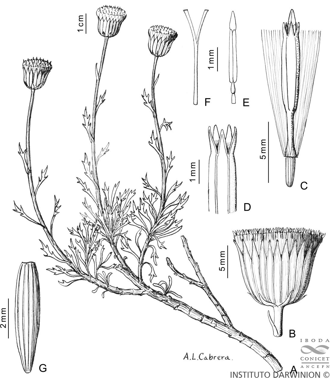 A. Rama florífera. B. Capítulo. C. Flor. D. Ápice de la corola. E. Estambre. F. Porción superior del estilo. G. Aquenio.