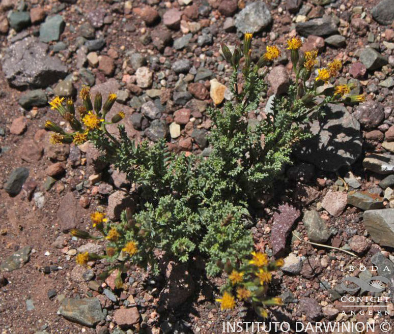 Sufrútices, densamente ramosos, de 10-20 cm de alto, glabros; tallos ascendentes, foliosos hasta el ápice. Hojas alternas, sésiles, pinnatisectas, raquis linear de 10-20 × 0,5-1 mm y 6-8 pares de segmentos agudos o subobtusos, 2-3-partidos, de 1-5 × 0,5 mm. Capítulos subdiscoides, largamente pedunculados, dispuestos de 2-4 en cimas corimbiformes en el ápice de las ramas. Involucro cilíndrico, de 10-11 × ca. 5 mm, brevemente caliculado; filarios 8-14, lineares, agudos, acuminados. Flores dimorfas, las del margen ca. 5, con corolas amarillas, liguladas y lígula de (2-)6-7 mm de largo o con corolas filiformes, ca. 3 mm de largo; las del centro ca. 15, con corolas amarillas, tuulosas, ca. 5,5 mm de largo, 5-lobadas. Aquenios cilindroides, de 4-5 mm de largo, densa y cortamente pilosos. Papus blanco de unos 6 mm de largo.