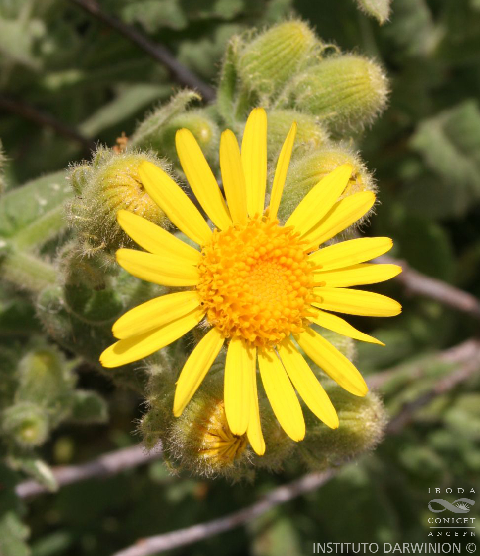 Sufrútices ramosos en la base, ca. 1 m de alto, densamente pubescente-glandulosos; tallos ascendentes, hojosos hasta la inflorescencia. Hojas oblanceolado-espatuladas, obtusas en el ápice, aserrado-dentadas en el margen, densamente glanduloso-pubescentes en ambas caras; hojas superiores sésiles y auriculadas en la base, las inferiores de 4-12 × 1,2-3,5 cm, atenuadas en pseudopecíolo auriculado. Capítulos radiados, largamente pedunculados, dispuestos en cimas corimbiformes paucicéfalas, laxas. Involucro acampanado, de 14-15 × 15-18 mm; brácteas del calículo pocas, lineares, cortas; filarios ca. 20, linear-lanceolados, atenuados en el ápice, glanduloso-pubescentes en el dorso. Flores dimorfas, las del margen 18-20, con corolas amarillas, liguladas, lígula oblonga, ca.13 × 3 mm; las del centro numerosas, con corolas tubulosas, ca. 12 mm de largo, cortamente 5-lobadas. Aquenios glabros o pilosos. Papus blanco de unos 11 mm de largo.