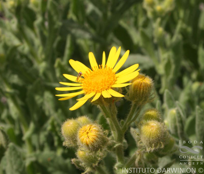 Sufrútices ramosos en la base, ca. 1 m de alto, densamente pubescente-glandulosos; tallos ascendentes, hojosos hasta la inflorescencia. Hojas oblanceolado-espatuladas, obtusas en el ápice, aserrado-dentadas en el margen, densamente glanduloso-pubescentes en ambas caras; hojas superiores sésiles y auriculadas en la base, las inferiores de 4-12 × 1,2-3,5 cm, atenuadas en pseudopecíolo auriculado. Capítulos radiados, largamente pedunculados, dispuestos en cimas corimbiformes paucicéfalas, laxas. Involucro acampanado, de 14-15 × 15-18 mm; brácteas del calículo pocas, lineares, cortas; filarios ca. 20, linear-lanceolados, atenuados en el ápice, glanduloso-pubescentes en el dorso. Flores dimorfas, las del margen 18-20, con corolas amarillas, liguladas, lígula oblonga, ca.13 × 3 mm; las del centro numerosas, con corolas tubulosas, ca. 12 mm de largo, cortamente 5-lobadas. Aquenios glabros o pilosos. Papus blanco de unos 11 mm de largo.