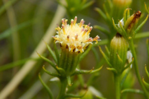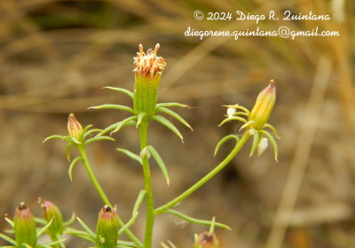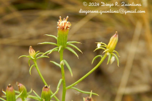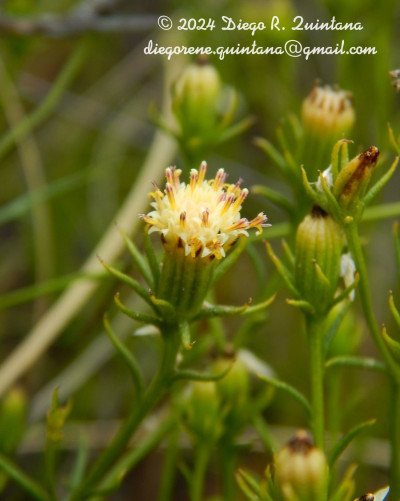 Sufrútices ramosos, de 20-30 cm de alto, tuberculado-glandulosos; tallos muy ramificados y densamente hojosos hasta el ápice. Hojas alternas, sésiles, tuberculado-glandulosas, profundamente pinnatilobadas, con raquis estrechamente linear, de 20-30 × 0,5 mm, con 1-3 pares de segmentos estrechísimos, de 2-6 mm de largo. Capítulos discoides, pocos, solitarios en el ápice del tallo y de sus ramas. Involucro acampanado, de 9-10 × 5-7 mm; brácteas del calículo numerosas, 2-3-seriadas, lineares, casi tan largas como el involucro; filarios 16-22, lineares, atenuados y penicilados en el ápice, menudamente tuberculado-glandulosos en el dorso. Flores isomorfas, numerosas, con corolas de color amarillo pálido, tubulosas, ca. 5 mm de largo, 5-lobadas. Aquenios cilindroides, glabros. Papus blanco de unos 4 mm de largo.