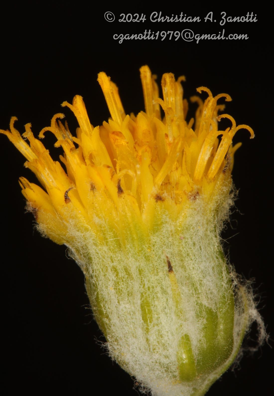 Sufrútices densamente ramosos, de 10-15 cm de alto, laxamente tomentosos; tallos hojosos hasta el ápice. Hojas alternas, oblanceoladas, de 2-2,5 cm × 2-5 mm, atenuadas en la base, agudas en el ápice, dentadas en los márgenes, laxamente albo-tomentosas en ambas caras. Capítulos discoides, solitarios o geminados en los ápices de los tallos. Involucro acampanado, ca. 10 × 9 mm; brácteas del calículo pocas, lineares, más largas que la mitad del involucro; filarios ca. 13, lineares, albo-tomentosos en el dorso. Flores isomorfas, numerosas, con corolas tubulosas, ca. 0,7 mm de largo, cortamente 5-lobadas, lóbulos triangulares, ca. 0,5 mm de largo. Aquenios cilindroides, costados, glabros. Papus blanco ca. 6,5 mm de largo.