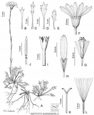 Hierbas perennes, de 5-25 cm de alto, glabras o levemente papilosas; tallos erectos, escapiformes, con hojas arrosetadas en la base y brácteas lineares esparcidas en la parte superior. Hojas oblanceolado-espatuladas, de 2-4 cm × 5-8 mm, largamente atenuadas en un pseudopecíolo envainador, 3-fidas o 5-fidas en la parte superior. Capítulos radiados, solitarios el ápice de los tallos. Involucro acampanado, de 5-7 × 5-6 mm, sin verdadero calículo, sólo con 2-3 brácteas en la base; filarios 11-16, oblongos, atenuados en el ápice, glabros en el dorso. Flores dimorfas, las del margen blancas, 10-16, liguladas, las del centro amarillas, numerosas. Aquenios glabros.
