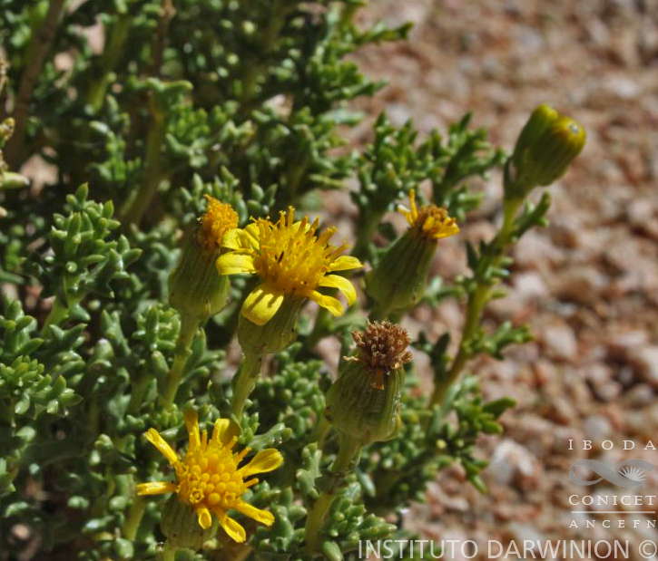 Arbustos muy ramosos, de 0,4-1 m de alto, glabros; tallos hojosos hasta el ápice. Hojas algo carnosas, pinnatisectas, con raquis linear, de 10-25 × 0,5-1 mm y 3-5 pares de segmentos estrechamente lineares, de 2-7 × 0,5-1 mm, agudos, enteros o partidos. Capítulos radiados, dispuestos en cimas corimbiformes paucicéfalas en el extremo de las ramas. Involucro cilíndrico, de 6-7 × ca. 5 mm; brácteas del calículo pocas, lanceoladas y cortas; filarios 12-13, linear-lanceolados, agudos en el ápice, glabros en el dorso. Flores dimorfas, las del margen 8-10, con corolas liguladas; las del centro numerosas, con corolas tubulosas, ca. 7 mm de largo, cortamente 5-lobadas. Aquenios cilindroides, glabros. Papus blanco, casi tan largo como las corolas.