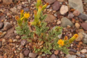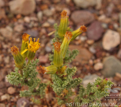 Arbustos densamente ramosos, de 20-40 cm de alto, glabros; tallos densamente hojosos. Hojas alternas, sésiles, glabras o ligeramente granuloso-glandulosas en ambas caras, profundamente pinnatisectas, con raquis de 10-18 × 0,5-1 mm y 4-6 pares de segmentos enteros o divididos en la base, glabros o glandulosos, de 1-3 × 0,4-0,7 mm. Capítulos discoides, dispuestos en cimas corimbiformes, 3-5-céfalas, en los ápices de los tallos; pedúnculos de 3-7 mm de largo. Involucro cilíndrico, ca. 9 × 2,5 mm, ecaliculado; filarios ca. 5, lanceolados, penicilados en el ápice y glabros el dorso. Flores dimorfas, las del margen 1, con corola amarilla, filiforme ca. 5 mm de largo y estilo exerto; las del centro 5, con corolas tubulosas, ca. 8 mm de largo, cortamente 5-lobadas, lóbulos triangulares, de 0,5-0,7 mm de largo. Aquenios cilindroides, densa y cortamente seríceo-pubescentes. Papus blanco de 7-8 mm de largo.