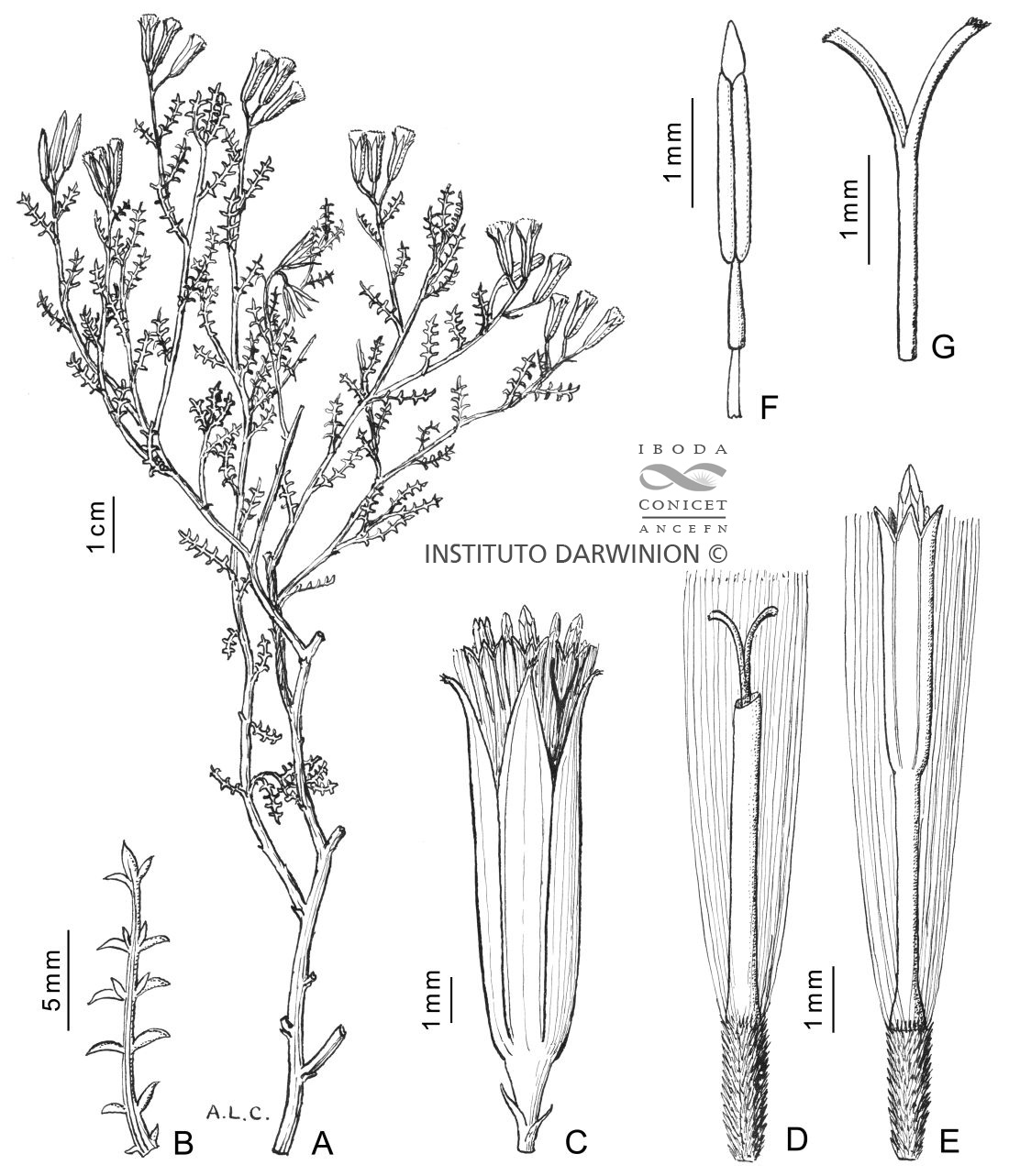 Arbustos densamente ramosos, de 20-40 cm de alto, glabros; tallos densamente hojosos. Hojas alternas, sésiles, glabras o ligeramente granuloso-glandulosas en ambas caras, profundamente pinnatisectas, con raquis de 10-18 × 0,5-1 mm y 4-6 pares de segmentos enteros o divididos en la base, glabros o glandulosos, de 1-3 × 0,4-0,7 mm. Capítulos discoides, dispuestos en cimas corimbiformes, 3-5-céfalas, en los ápices de los tallos; pedúnculos de 3-7 mm de largo. Involucro cilíndrico, ca. 9 × 2,5 mm, ecaliculado; filarios ca. 5, lanceolados, penicilados en el ápice y glabros el dorso. Flores dimorfas, las del margen 1, con corola amarilla, filiforme ca. 5 mm de largo y estilo exerto; las del centro 5, con corolas tubulosas, ca. 8 mm de largo, cortamente 5-lobadas, lóbulos triangulares, de 0,5-0,7 mm de largo. Aquenios cilindroides, densa y cortamente seríceo-pubescentes. Papus blanco de 7-8 mm de largo.