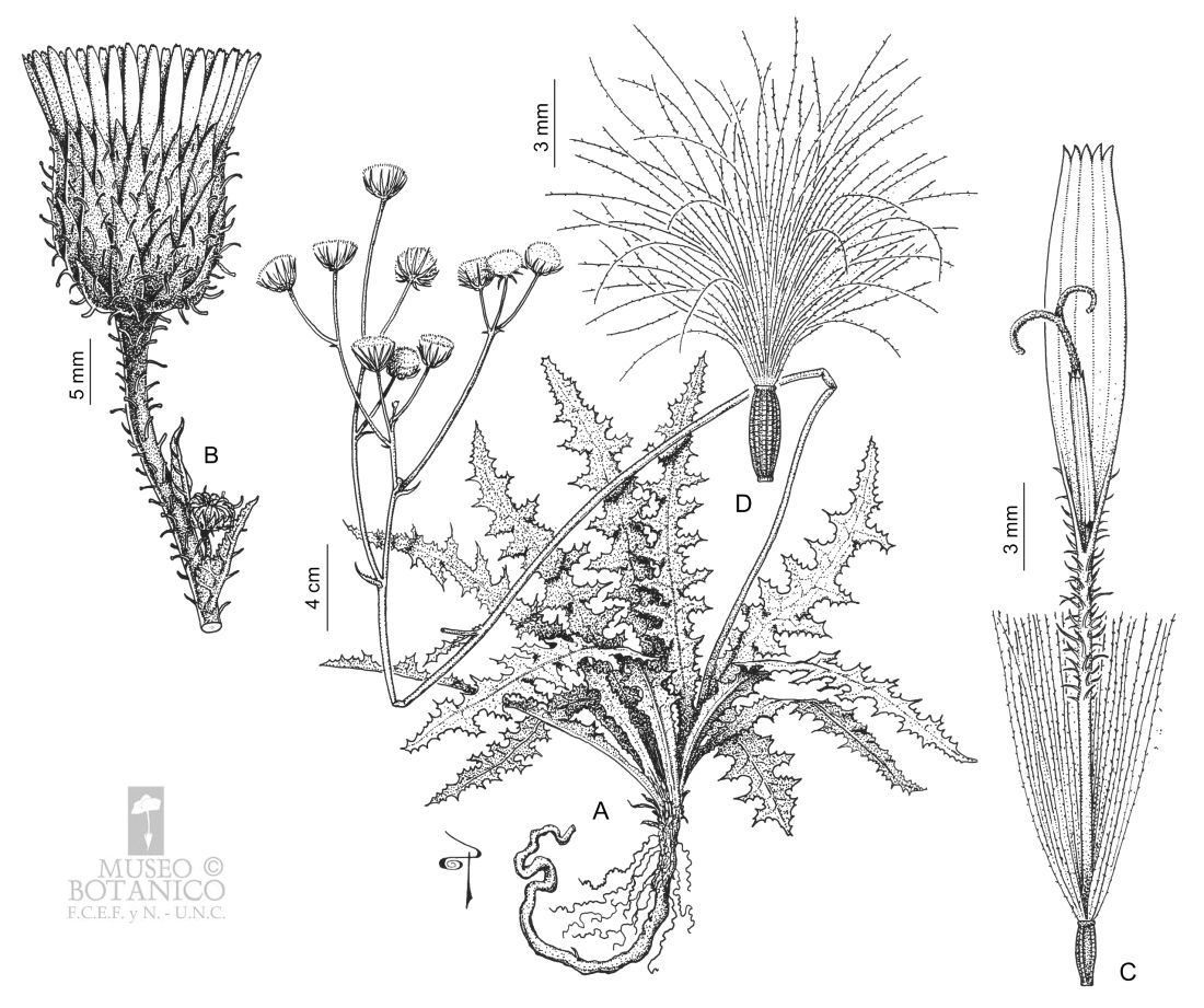 Hierbas perennes, hasta de 90 cm de alto; rizomas verticales, a veces unidos a rizomas horizontales; tallos simples, erectos, hojosos, glabros, subglabros y con pelos glandulares capitados en la porción superior. Hojas basales sésiles, runcinado-partidas, con lóbulos denticulado-espinulosos, atenuados en la base; hojas caulinares sésiles, gradualmente menores, auriculadas, redondeadas y semiabrazadoras, espinulosas. Capítulos largamente pedunculados, dispuestos en cimas corimbiformes paucicéfalas. Involucro anchamente acampanado; filarios linearlanceolados, obtusos, con pelos glandulares capitados. Flores con corolas amarillas, ca. 20 mm de largo. Aquenios ligeramente comprimidos, oblongoides u obovado-oblongoides, de 2,5-3,5 mm de largo, pluricostados, con estrías denticuladas transversales. Papus blanco, ca. 10 mm de largo.