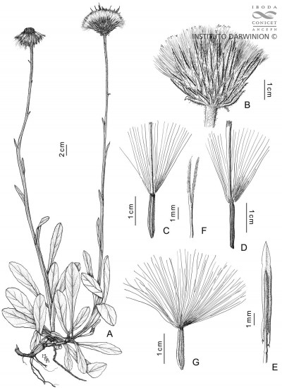 Hierbas de 20-40 cm de alto, laxamente hirsutas; tallos simples, delicados, estrechamente alados, alas ca. 0,5 mm de ancho, hirsutos, con hojas reducidas y distantes. Hojas inferiores arrosetadas, oblanceoladas a obovadas, de 4,5-5 × 1,1-2,6 cm, atenuadas en la base, obtusas en el ápice, desde enteras hasta levemente aserrado-mucronadas en el margen, laxamente hirsutas a glabrescentes en ambas caras. Capítulos solitarios. Involucro acampanado, de 1-1,5 × 1-1,2 cm; filarios numerosos, 4-5-seriados, los externos linear-lanceolados, agudos en el ápice, densamente villosos y glandulosos en dorso, los internos gradualmente más largos y rígidos, sólo villosos en la parte superior. Flores con corola lilacina, las del margen muy numerosas, con corola filiforme, ca. 4,5 mm de largo, bilabiada en el ápice; las del centro numerosas, con corola tubulosa, ca. 6 mm de largo, 5-lobada. Aquenios glabros o laxamente pubescentes en la base. Papus leonado tan largo como la corola.