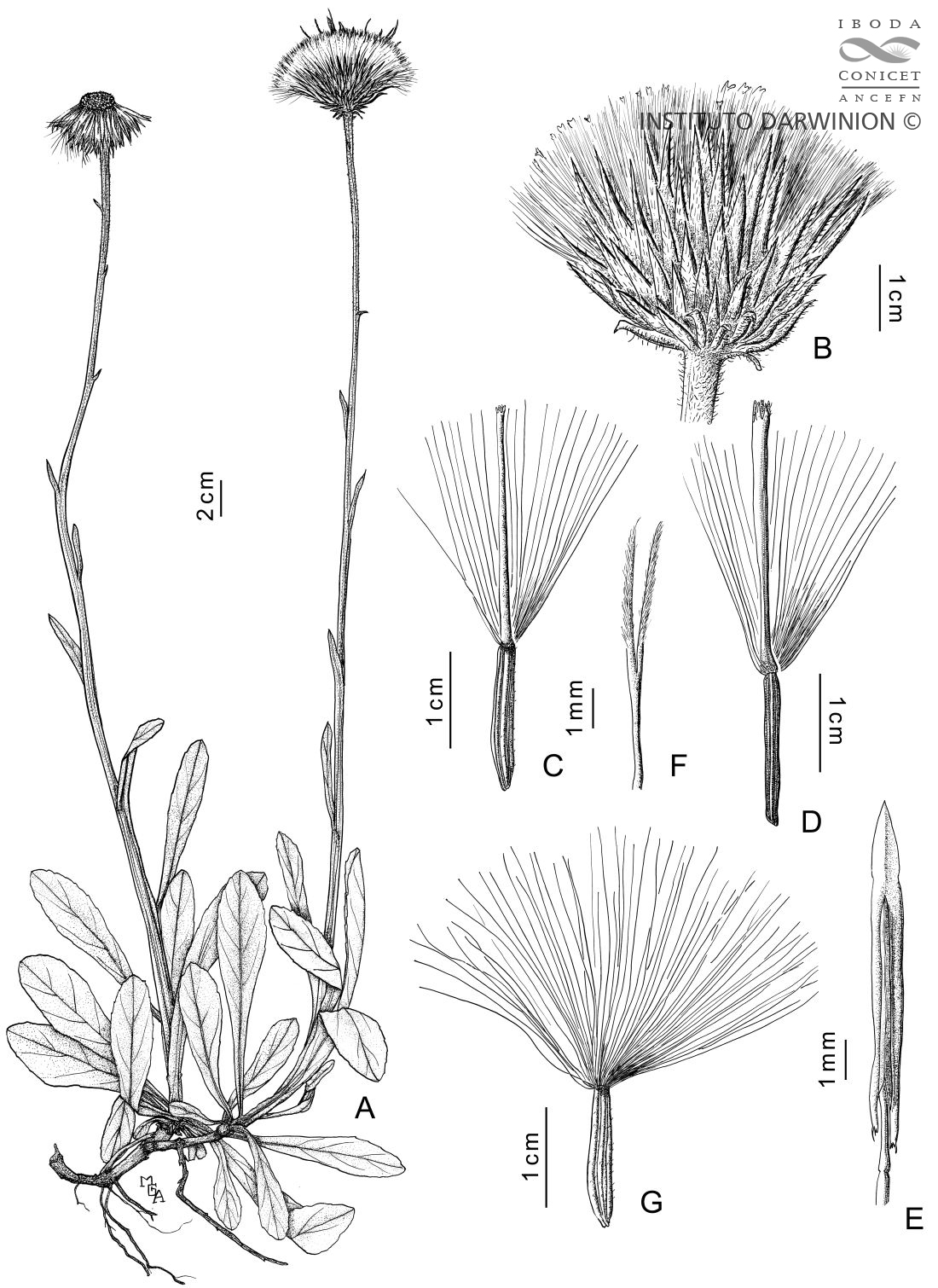 Hierbas de 20-40 cm de alto, laxamente hirsutas; tallos simples, delicados, estrechamente alados, alas ca. 0,5 mm de ancho, hirsutos, con hojas reducidas y distantes. Hojas inferiores arrosetadas, oblanceoladas a obovadas, de 4,5-5 × 1,1-2,6 cm, atenuadas en la base, obtusas en el ápice, desde enteras hasta levemente aserrado-mucronadas en el margen, laxamente hirsutas a glabrescentes en ambas caras. Capítulos solitarios. Involucro acampanado, de 1-1,5 × 1-1,2 cm; filarios numerosos, 4-5-seriados, los externos linear-lanceolados, agudos en el ápice, densamente villosos y glandulosos en dorso, los internos gradualmente más largos y rígidos, sólo villosos en la parte superior. Flores con corola lilacina, las del margen muy numerosas, con corola filiforme, ca. 4,5 mm de largo, bilabiada en el ápice; las del centro numerosas, con corola tubulosa, ca. 6 mm de largo, 5-lobada. Aquenios glabros o laxamente pubescentes en la base. Papus leonado tan largo como la corola.