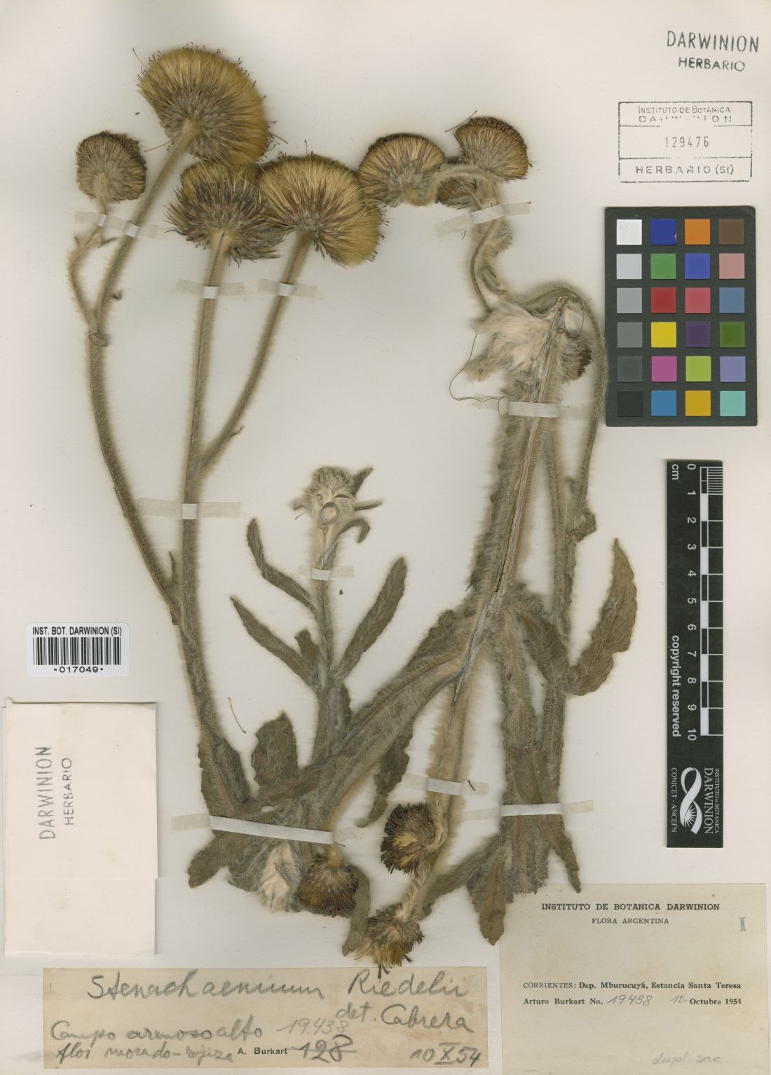 Hierbas de 0,3-1,6 m de alto, densamente hirsutas; tallos erectos, robustos, alados, alas anchas derechas u onduladas, de 3-7 mm de ancho, simples o ramificados en la parte superior, densamente hirsutos con pelos blancos ca. 2 mm de largo. Hojas inferiores arrosetadas, obovadas u oblanceoladas, de 11-30 × 3,5-8 cm, atenuadas en la base, obtusas en el ápice, desde enteras o ligera e irregularmente lobuladas hasta crenado-aserradas en el margen, laxa o densamente hirsutas en ambas caras; las caulinares aserradas en el margen, las superiores lineares, bracteiformes. Capítulos dispuestos en panojas, las que comúnmente terminan en cimas corimbiformes, largamente pedunculados; pedúnculos de más de 10 cm de largo, densamente hirsutos. Involucro hemisférico o acampanado, de 1,5-2 × 3-4 cm; filarios 5-6-seriados, los externos lanceolados, acuminados en el ápice, densamente villosos en la parte superior; los internos más largos y rígidos. Flores con corola rosado-lilacina, las del margen muy numerosas, con corola filiforme, ca. 10 mm de largo, 3-dentada en el ápice; las del centro numerosas, con corola tubulosa, ca. 10 mm de largo, 5-lobada. Aquenios elípticos, comprimidos, 4-costados, glabros. Papus amarillo-rojizo, tan largo como la corola.