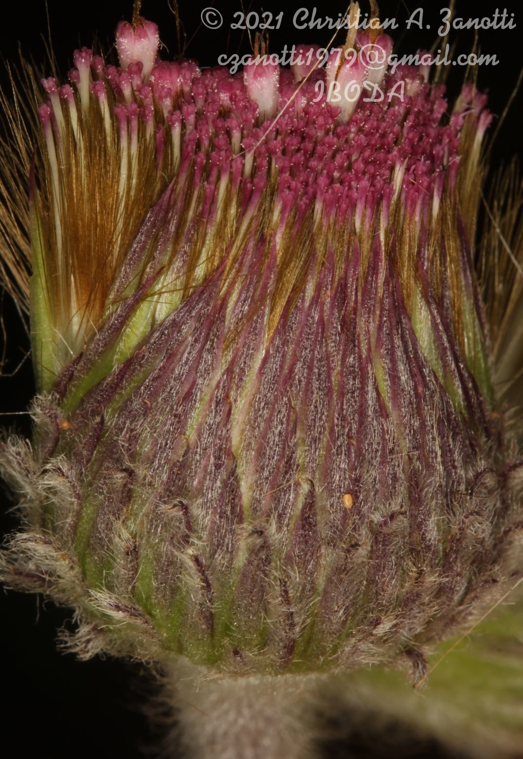 Hierbas de 0,3-1,6 m de alto, densamente hirsutas; tallos erectos, robustos, alados, alas anchas derechas u onduladas, de 3-7 mm de ancho, simples o ramificados en la parte superior, densamente hirsutos con pelos blancos ca. 2 mm de largo. Hojas inferiores arrosetadas, obovadas u oblanceoladas, de 11-30 × 3,5-8 cm, atenuadas en la base, obtusas en el ápice, desde enteras o ligera e irregularmente lobuladas hasta crenado-aserradas en el margen, laxa o densamente hirsutas en ambas caras; las caulinares aserradas en el margen, las superiores lineares, bracteiformes. Capítulos dispuestos en panojas, las que comúnmente terminan en cimas corimbiformes, largamente pedunculados; pedúnculos de más de 10 cm de largo, densamente hirsutos. Involucro hemisférico o acampanado, de 1,5-2 × 3-4 cm; filarios 5-6-seriados, los externos lanceolados, acuminados en el ápice, densamente villosos en la parte superior; los internos más largos y rígidos. Flores con corola rosado-lilacina, las del margen muy numerosas, con corola filiforme, ca. 10 mm de largo, 3-dentada en el ápice; las del centro numerosas, con corola tubulosa, ca. 10 mm de largo, 5-lobada. Aquenios elípticos, comprimidos, 4-costados, glabros. Papus amarillo-rojizo, tan largo como la corola.