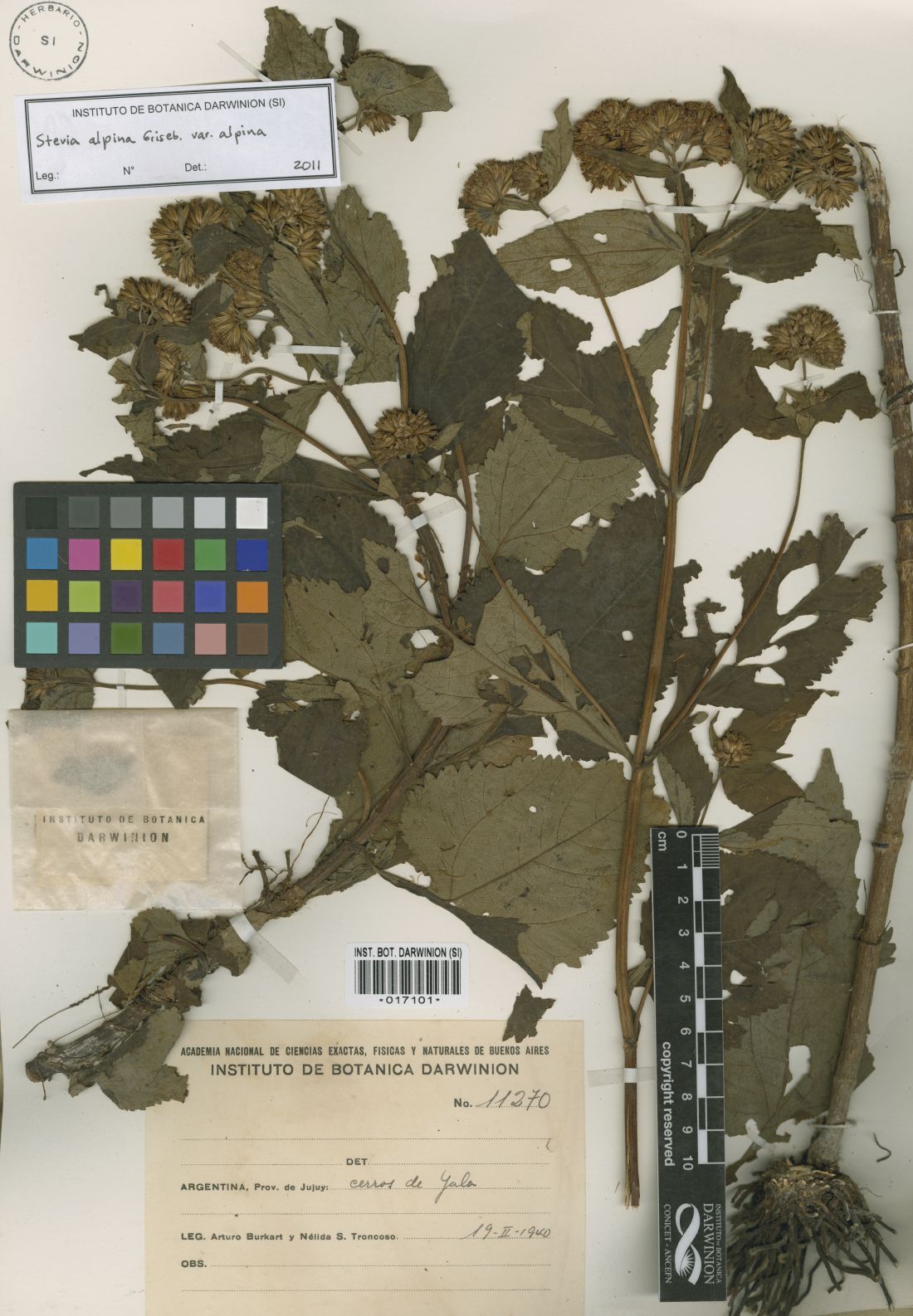 Sufrútices de 1,5-2 m de alto, con tallos erectos, laxamente pubérulos o glabros; tallos pubérulos. Hojas pecioladas (las superiores sésiles), ovadas, de 9-17 (incluido el pecíolo) × 3-8 cm, redondeadas y brevemente decurrentes en la base en un pecíolo alado cuneiforme y agudas en el ápice, aserradas, glabras en la haz y pubérulas sobre las nervaduras en el envés. Capítulos brevemente pedunculados, dispuestos en densos glomérulos que se agrupan en cimas corimbiformes terminales. Involucro de 7-8 mm de alto; filarios con pelos simples en el dorso, con o sin pelos glandulares. Flores con corolas blancas o rosadas. Papus dimorfo formado por escamitas cortas y 1-3 aristas de 1-3 mm de largo en los adelfocarpos y sólo por escamitas en el idiocarpo.