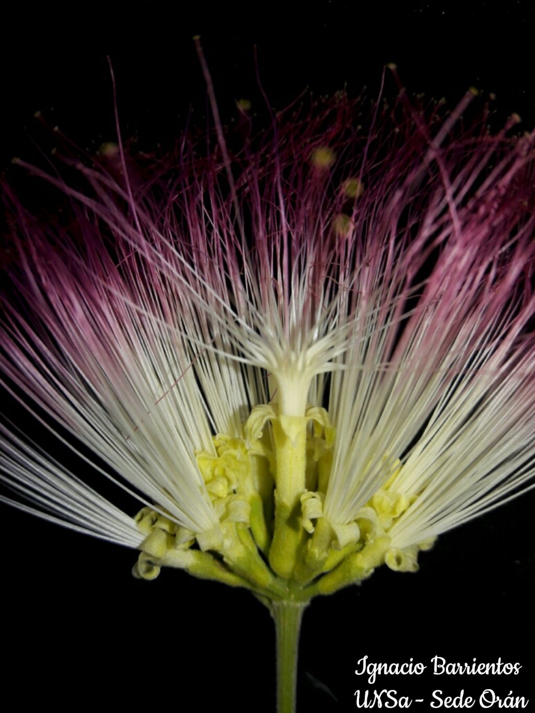 Árbol pequeño de 3-8(-10) m de altura y 20-30 cm diám., con ramificación simpodial y fuste breve, ocasionalmente de hábito arbustivo; copa amplia de ramas plagiótropas. Corteza amarillenta, gruesa y corchosa, profundamente fisurada longitudinalmente. Ramas hornótinas floríferas con densa pubescencia amarillenta de tricomas simples. Hojas 4-6 yugadas, indumento de tricomas simples amarillentos; pecíolo de 4-6,5 cm, con una glándula pateliforme sésil basal en el haz, de 3- 3,2 x 2-2,2 mm, en vivo anaranjada, con margen irregular grueso y amarillo; raquis primario de 14-18 cm., eglanduloso; raquis secundario 2-4- yugado, desde 1 cm en las pinnas basales hasta 8,5 cm en las apicales, con una glándula entre cada par de folíolos, de 1 x 0,4-0,5 mm., pateliforme oval y amarilla. Folíolos de 2,5-5 x 2-3,8 cm, mayores hacia el ápice de cada pina, anchamente obovados o anchamente elípticos, asimétricos, de ápice redondeado a abruptamente agudo, base cuneada a redondeada, venación pinnada, densamente pubescentes en el haz, glaucos y tomentosos en el envés; peciólulos de 1,2-1,4 mm. Cabezuelas umbeliformes, (1-)2 en la axila de hojas histerantas en las ramas hornótinas, con hasta 30(-36) flores heteromorfas; pedúnculos de 7-8 cm, brácteas de 2 x 0,5 mm, obovadas a espatuladas, hirsuto-pubescentes. Flores periféricas con pedicelos de (0,1-0,2-)-0,4 cm, pubescentes; cáliz de 0,6-0,9 cm, tubular infundibuliforme, verde en vivo, velutino, con 5 lóbulos triangulares; corola de (0,9-)1,2-1,85 cm, infundibuliforme, amarilla en vivo, densamente serícea, con (4-)5(-6) lóbulos lanceolados provistos de numerosas papilas glandulares en el ápice; androceo de 3-4 cm, tubo estaminal de 1,3 cm, incluso o algo exserto, filamentos amarillo-claro en su mitad basal y rosados en la apical; ovario de 0,3-0,4 cm, sésil, oblongo, seríceo, pubescente hacia el ápice; estilo excéntrico, de 3 cm; estigma diminuto. Flor central sésil: cáliz tubular de 1,1 1,2 cm, urceolado, costado; corola de 2,2-2,4 cm, tubular, lóbulos regulares o irregulares, triangulares; androceo con el tubo estaminal robusto, inserto; ovario de 0,5 cm, angular-obovado; estigma subcapitado. Legumbre indehiscente, recta a subrecta, de 8-21 x 1,5-1,8 cm, ápice con mucrón curvo de 0,3-1 cm, márgenes engrosados de 0,3 0,4 mm lat..; epicarpo tomentoso, liso, suturas interseminales apenas distinguibles, longitudinal mente estriado cuando seco. Semillas uniseriadas, 10-20, de 1-1,9 x 0,4- 0,6 x 0,53- 0,63 cm, pardo oscuras, línea fisural de 0,7-0,9 x 0,3-0,5 cm, abierta hacia la micrópila, de contorno ovado a elíptico, área delimitada por la línea fisural con líneas de fractura longitudinales.